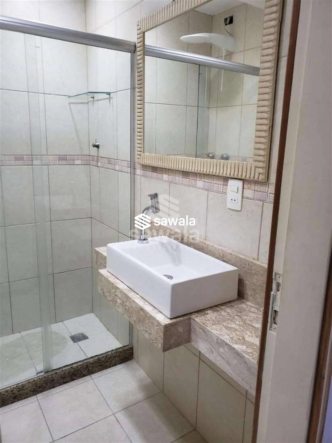 Banheiro social com box blindex, bancada em granito e armários