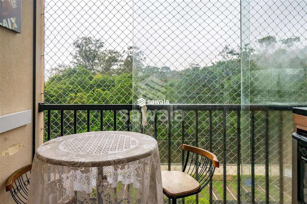 Sala ampla com cozinha americana e acesso a área de serviço, varanda com linda vista para o verde