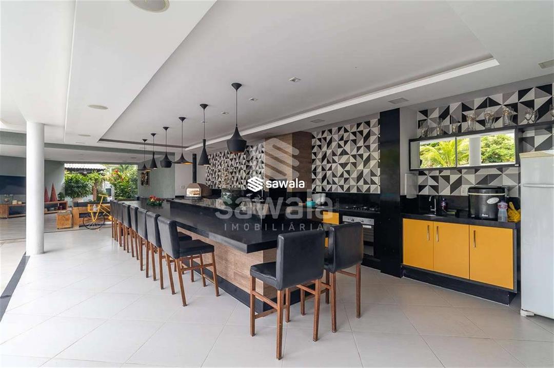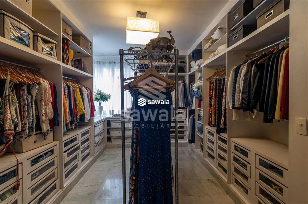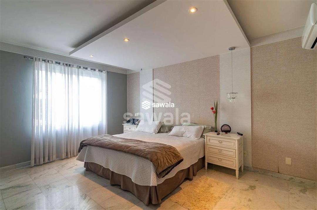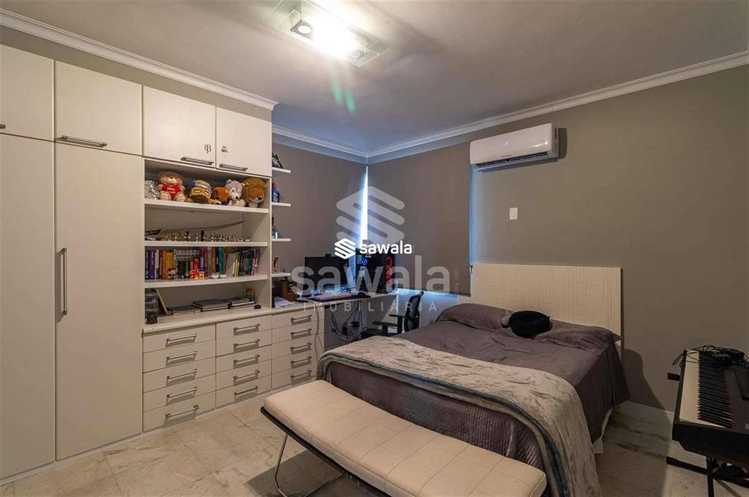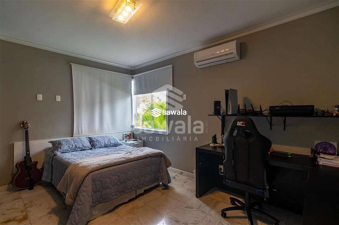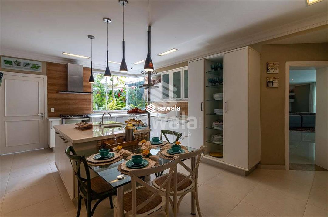 A cozinha, totalmente planejada, se integra à área de serviço completa, com despensa, guarda-volumes, dependência e banheiro de serviço. O segundo andar abriga quatro suítes independentes, acessadas por uma sala íntima, cada uma com armários planejados e amplas janelas que proporcionam luz natural e ventilação