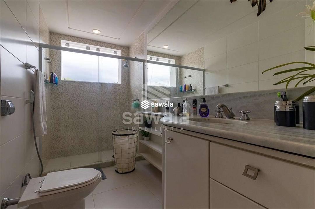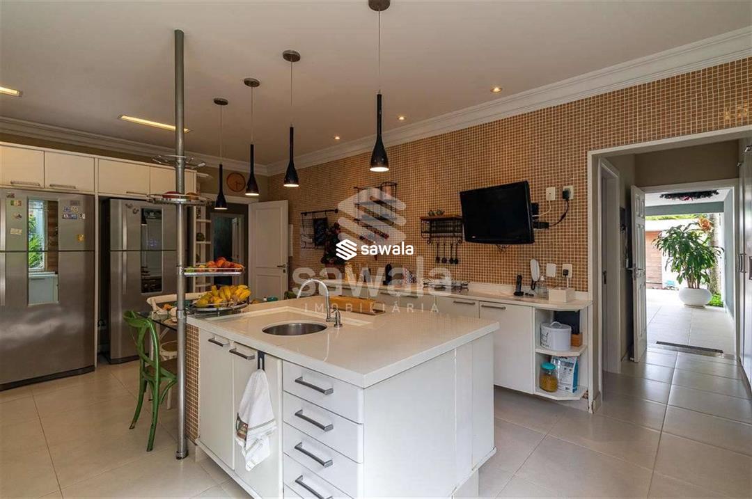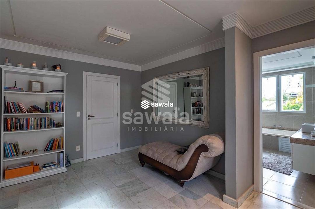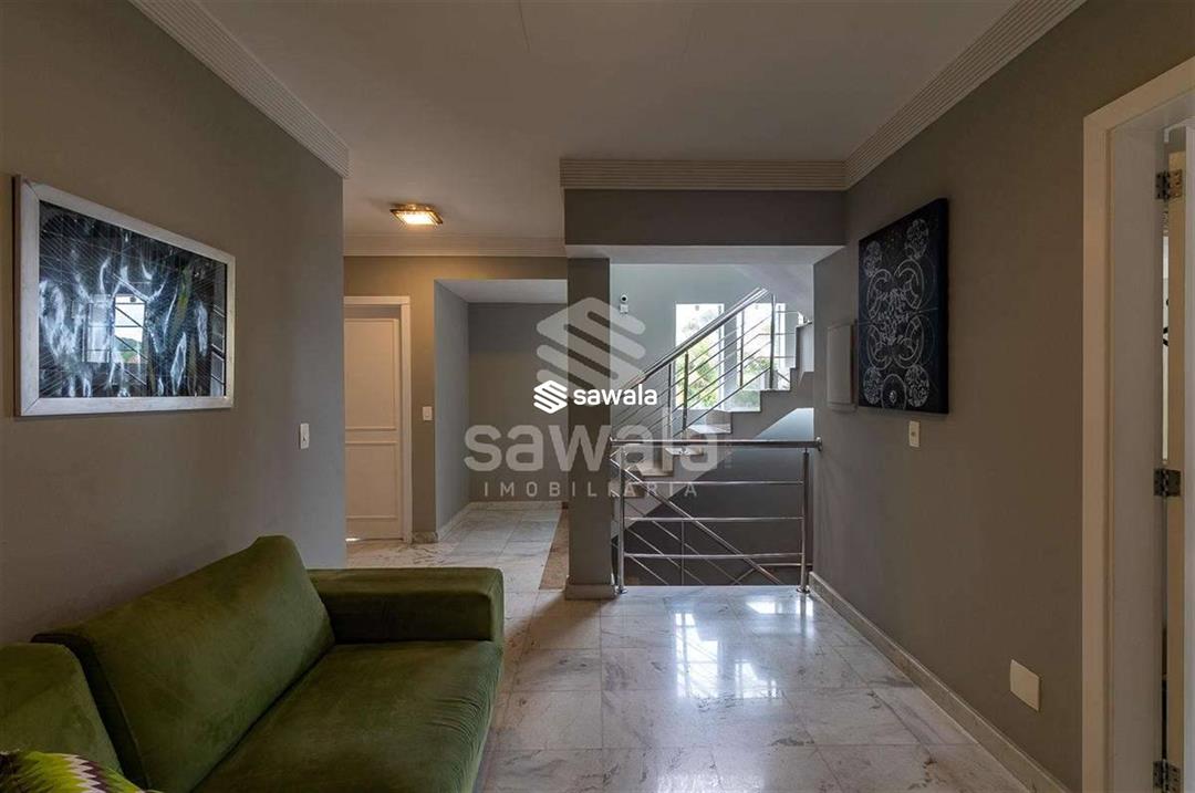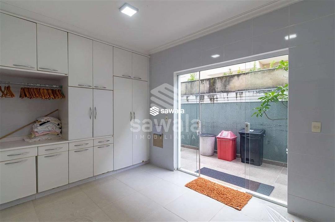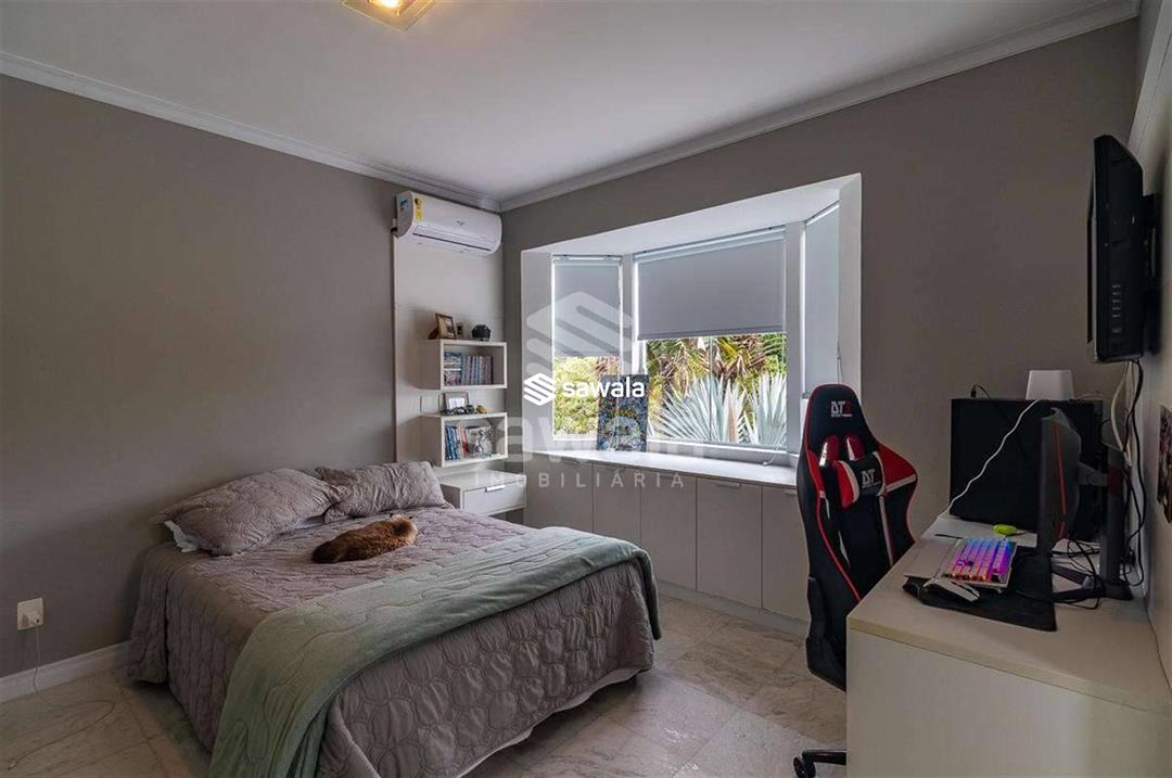 A cozinha, totalmente planejada, se integra à área de serviço completa, com despensa, guarda-volumes, dependência e banheiro de serviço. O segundo andar abriga quatro suítes independentes, acessadas por uma sala íntima, cada uma com armários planejados e amplas janelas que proporcionam luz natural e ventilação