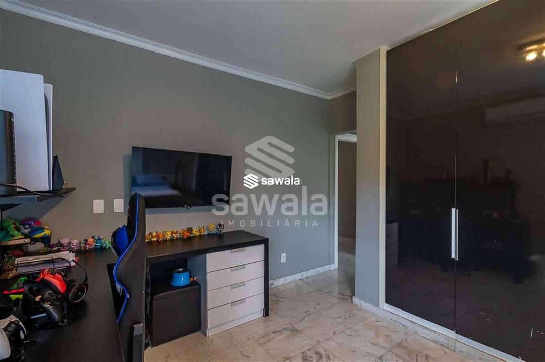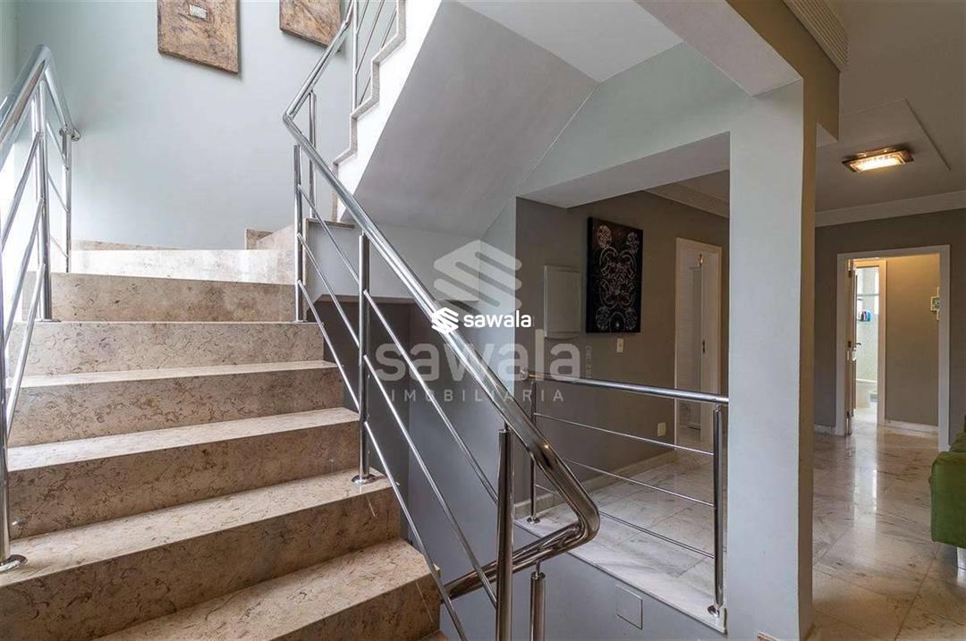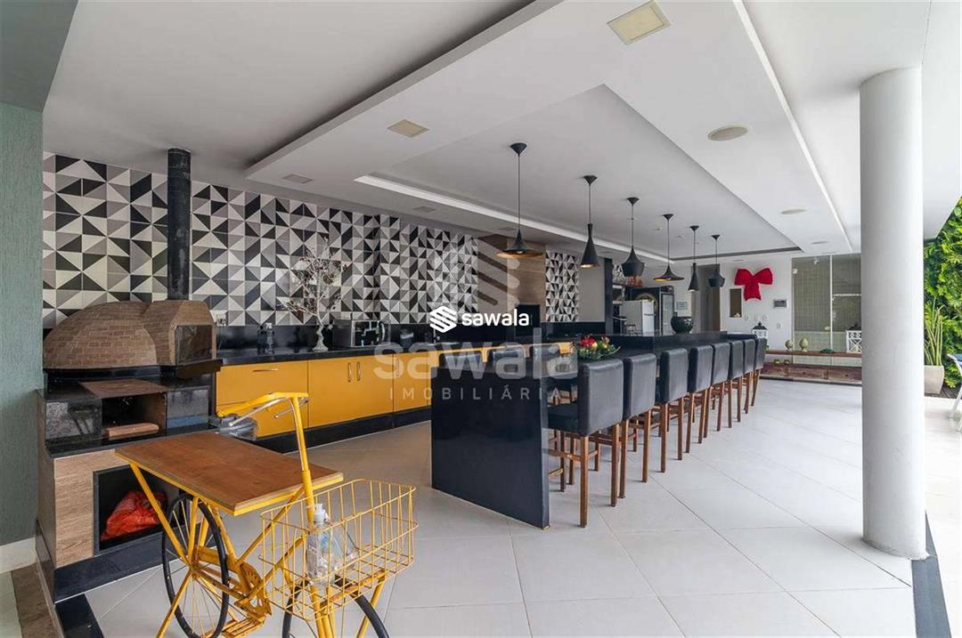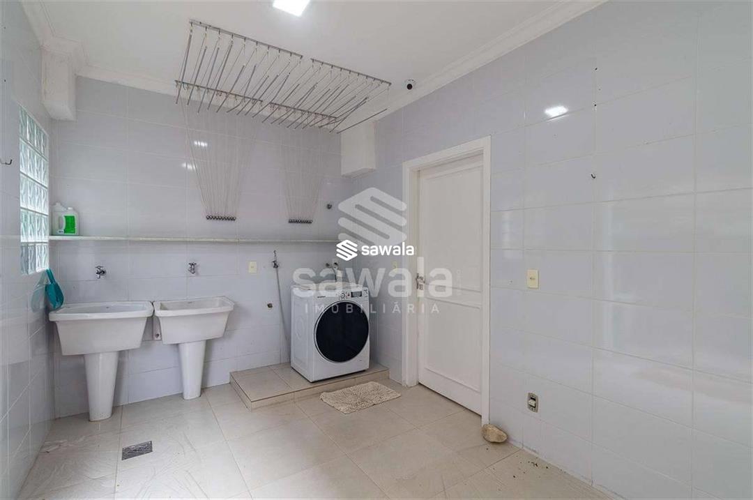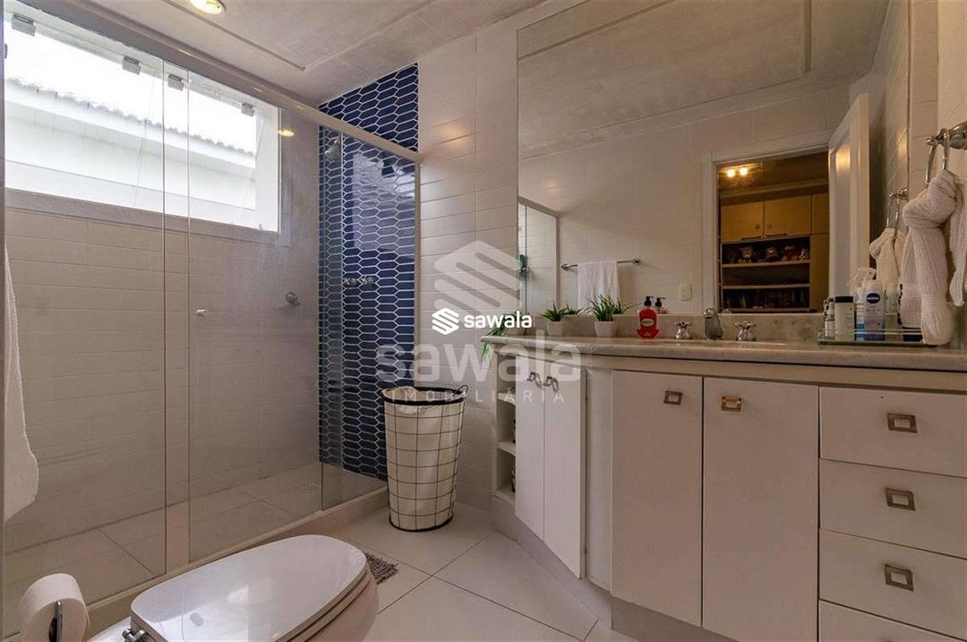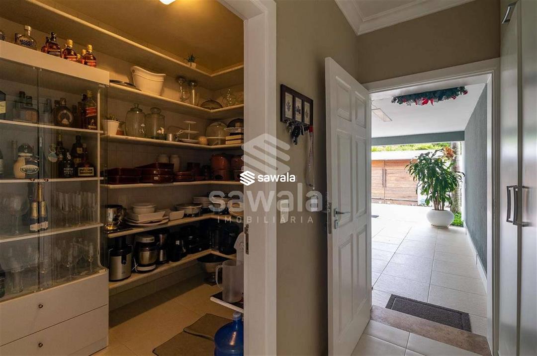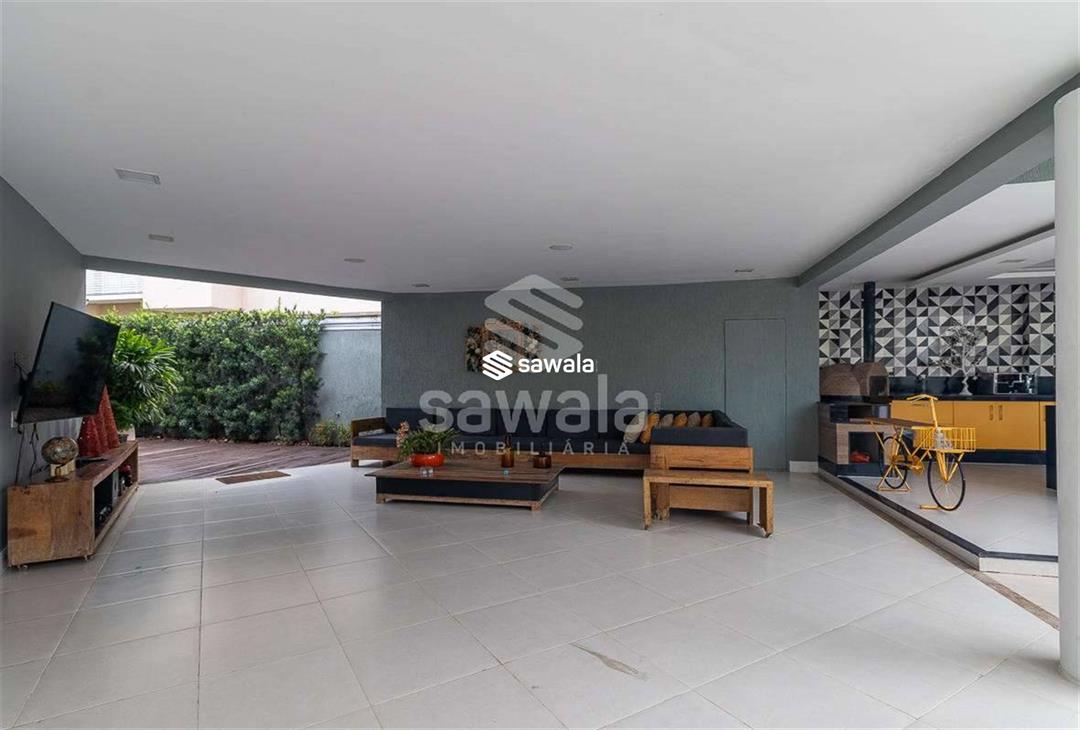 A cozinha, totalmente planejada, se integra à área de serviço completa, com despensa, guarda-volumes, dependência e banheiro de serviço. O segundo andar abriga quatro suítes independentes, acessadas por uma sala íntima, cada uma com armários planejados e amplas janelas que proporcionam luz natural e ventilação