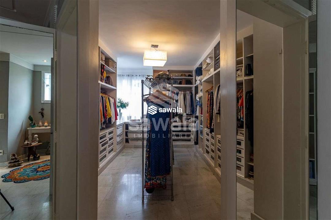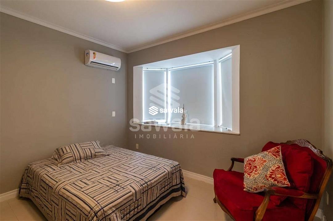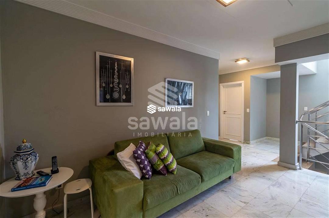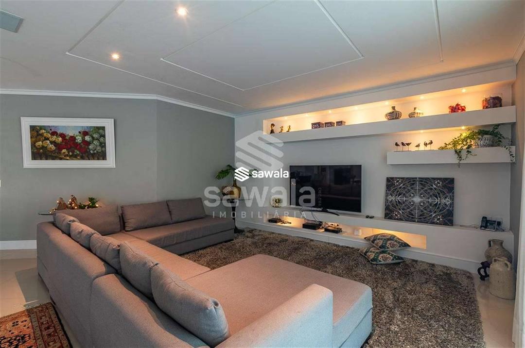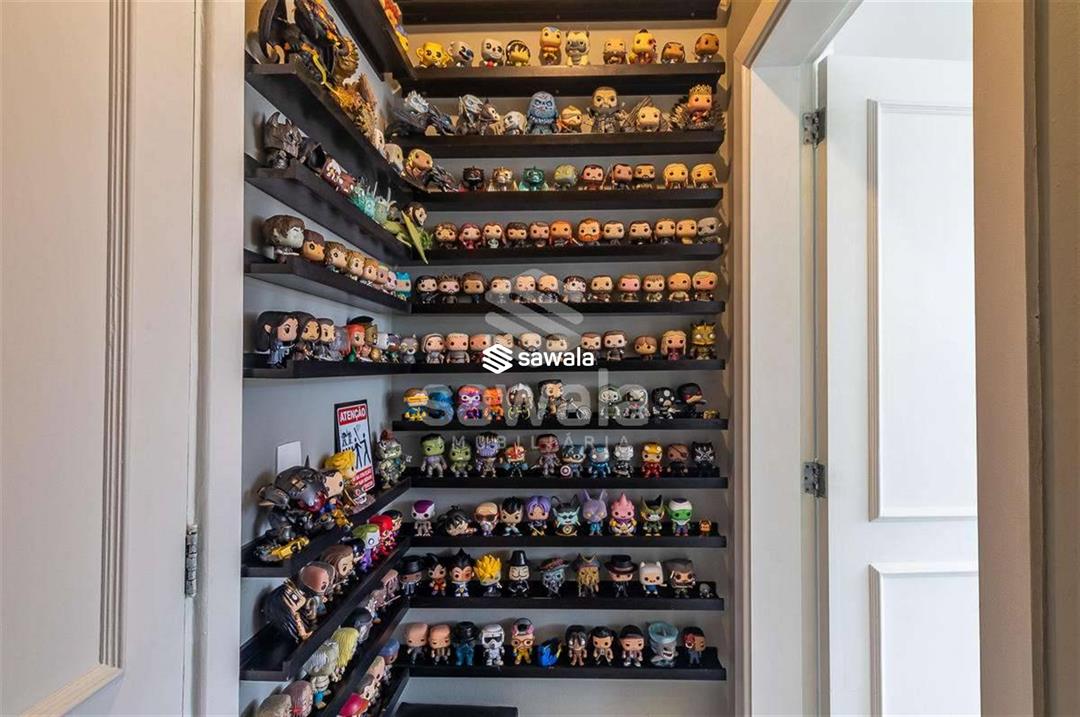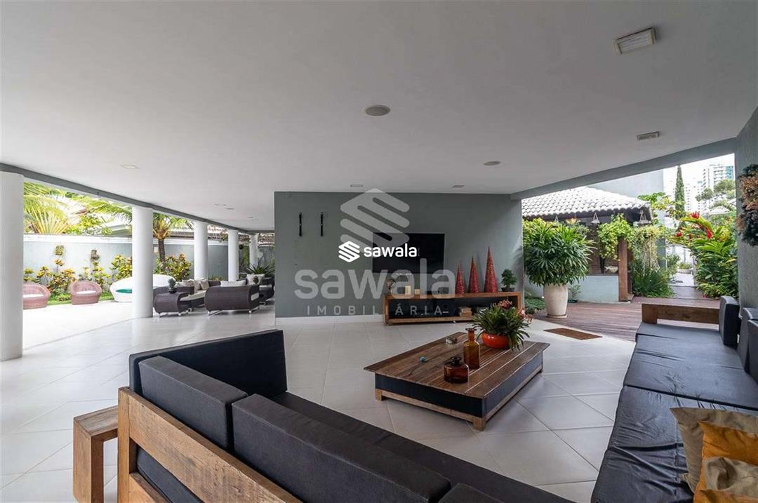 A cozinha, totalmente planejada, se integra à área de serviço completa, com despensa, guarda-volumes, dependência e banheiro de serviço. O segundo andar abriga quatro suítes independentes, acessadas por uma sala íntima, cada uma com armários planejados e amplas janelas que proporcionam luz natural e ventilação