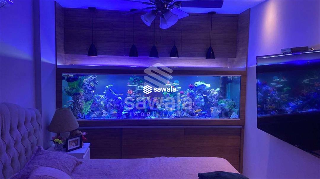 Banheiro social e da suíte com armários, espelhos e box fechado em blindex. Escada de acesso ao segundo pavimento em ferro com degraus bem largos em granito. O segundo pavimento é dividido em quarto bem amplo com armário e lindo aquário, banheiro social com armário, espelho e box fechado em blindex