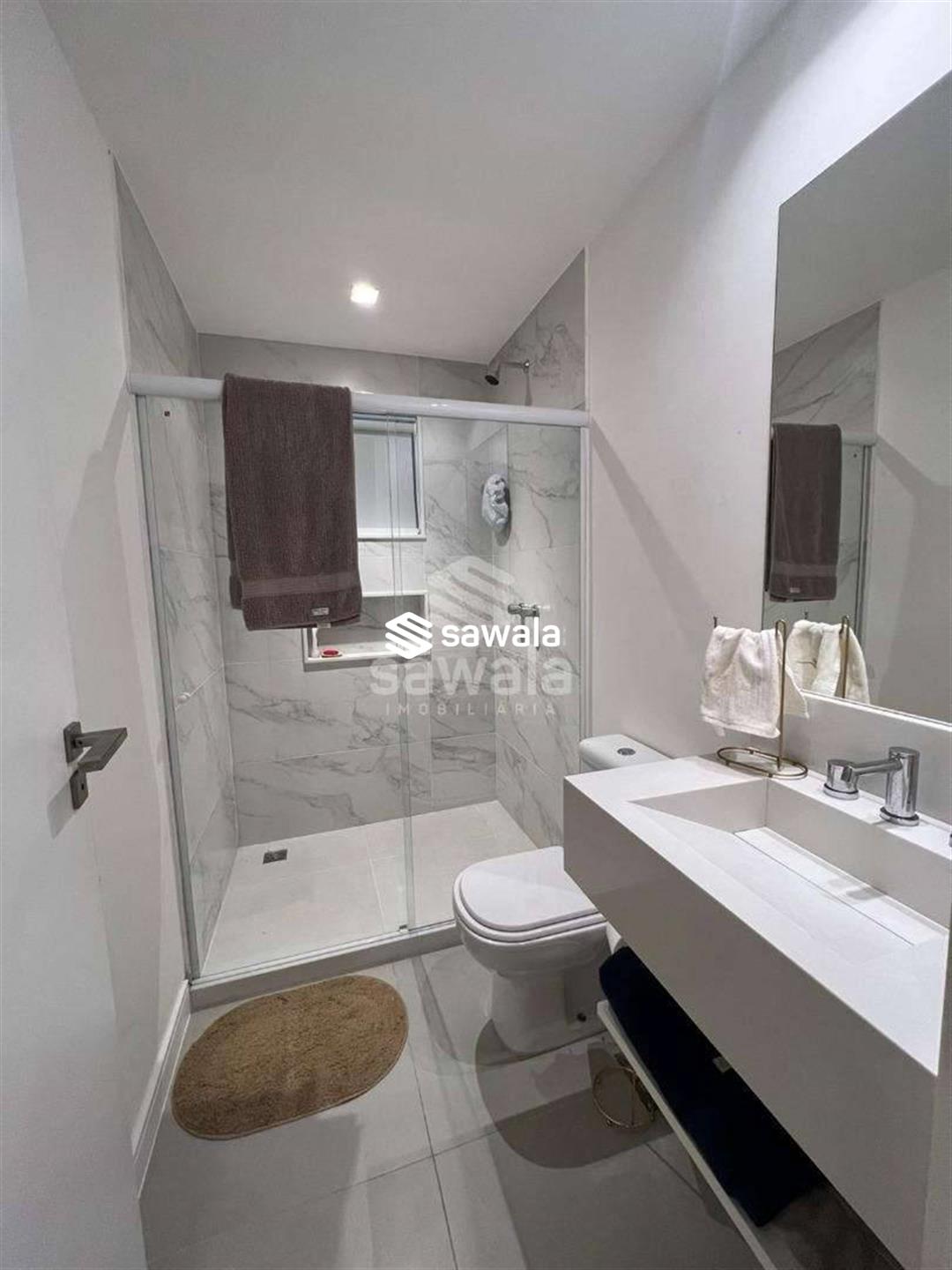 Os banheiros das suítes contam com piso porcelanato, espelho, armários planejados e blindex