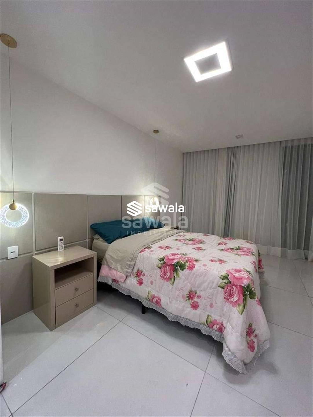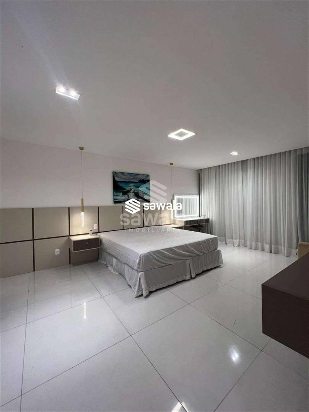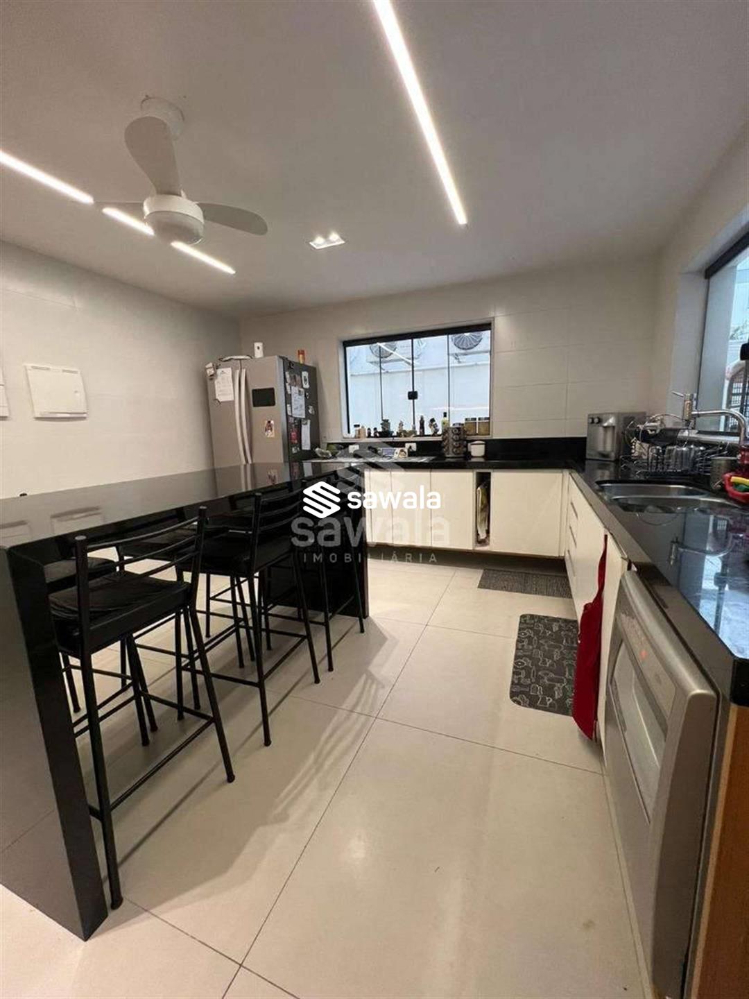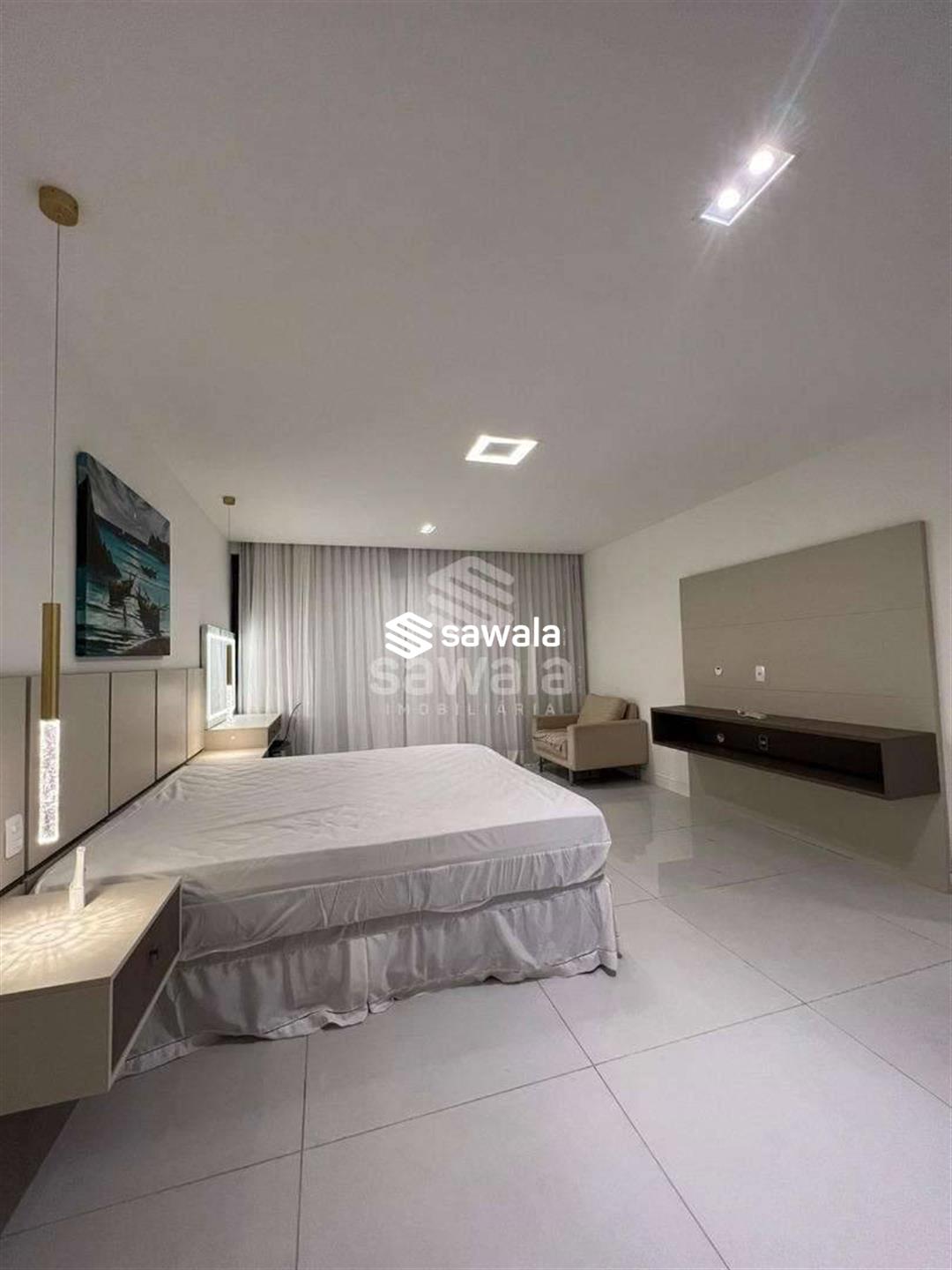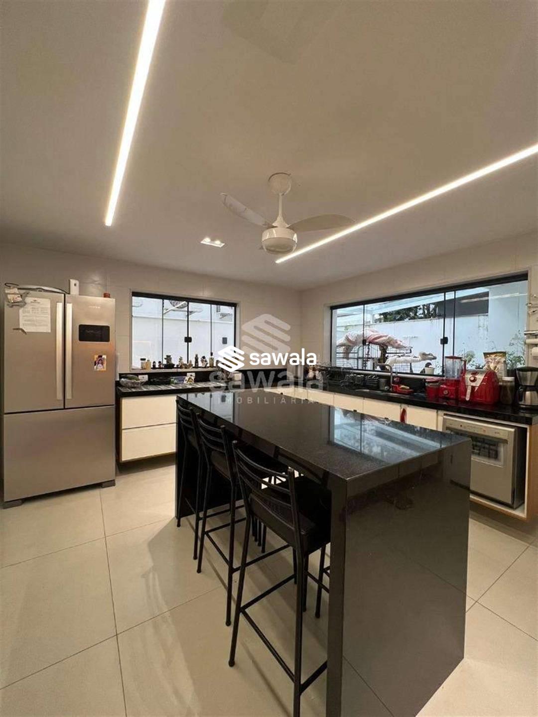 A copa cozinha possui armários planejados, bancadas em granito preto, cooktop por indução, ventilador de teto e forno, integrada à área de lavanderia. O segundo pavimento abriga 4 suítes requintadas, todas com piso em porcelanato, armários planejados, painéis de televisão e mesas de cabeceira, ar condicionado split, camas box e cortinas