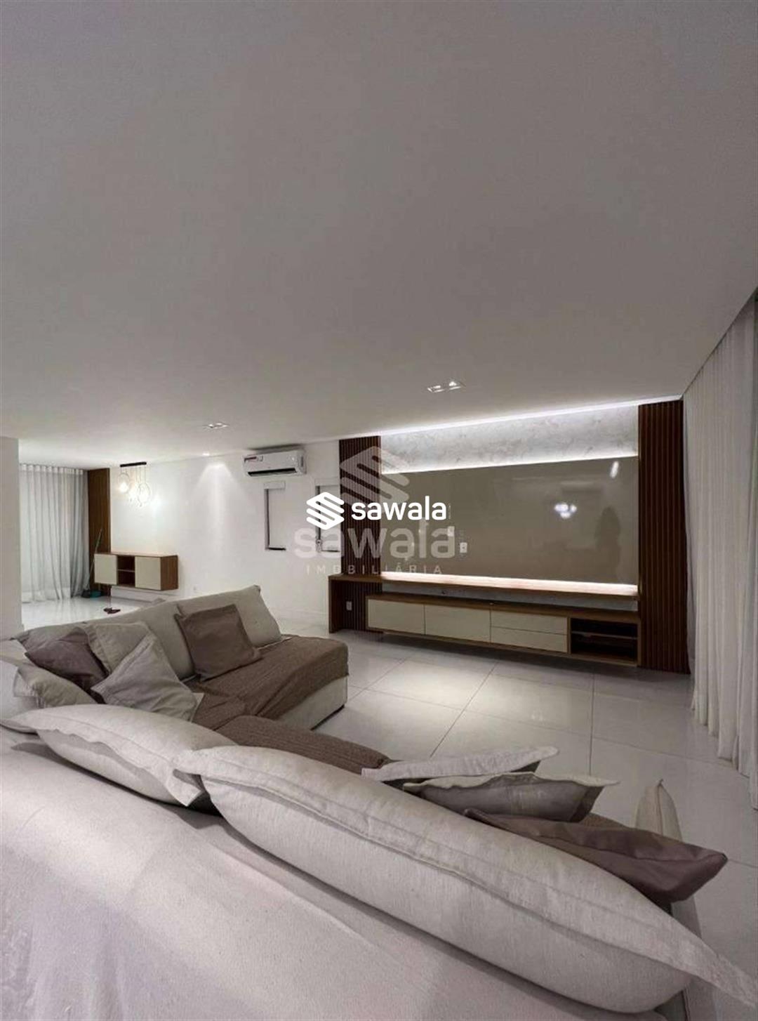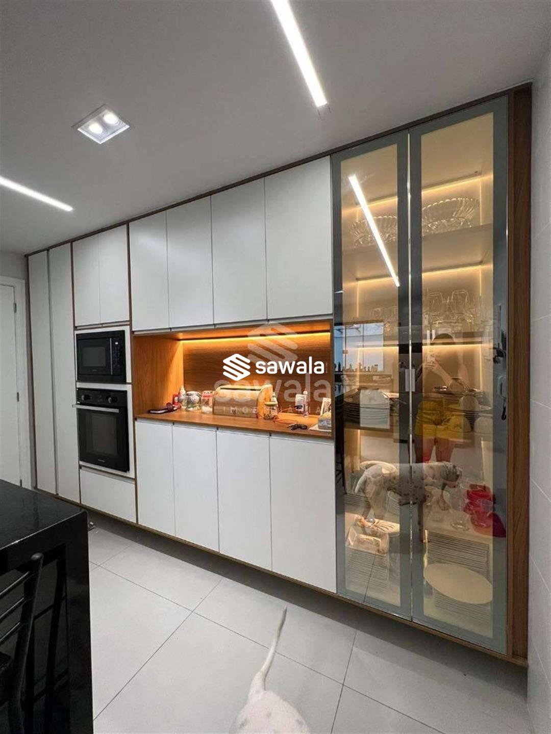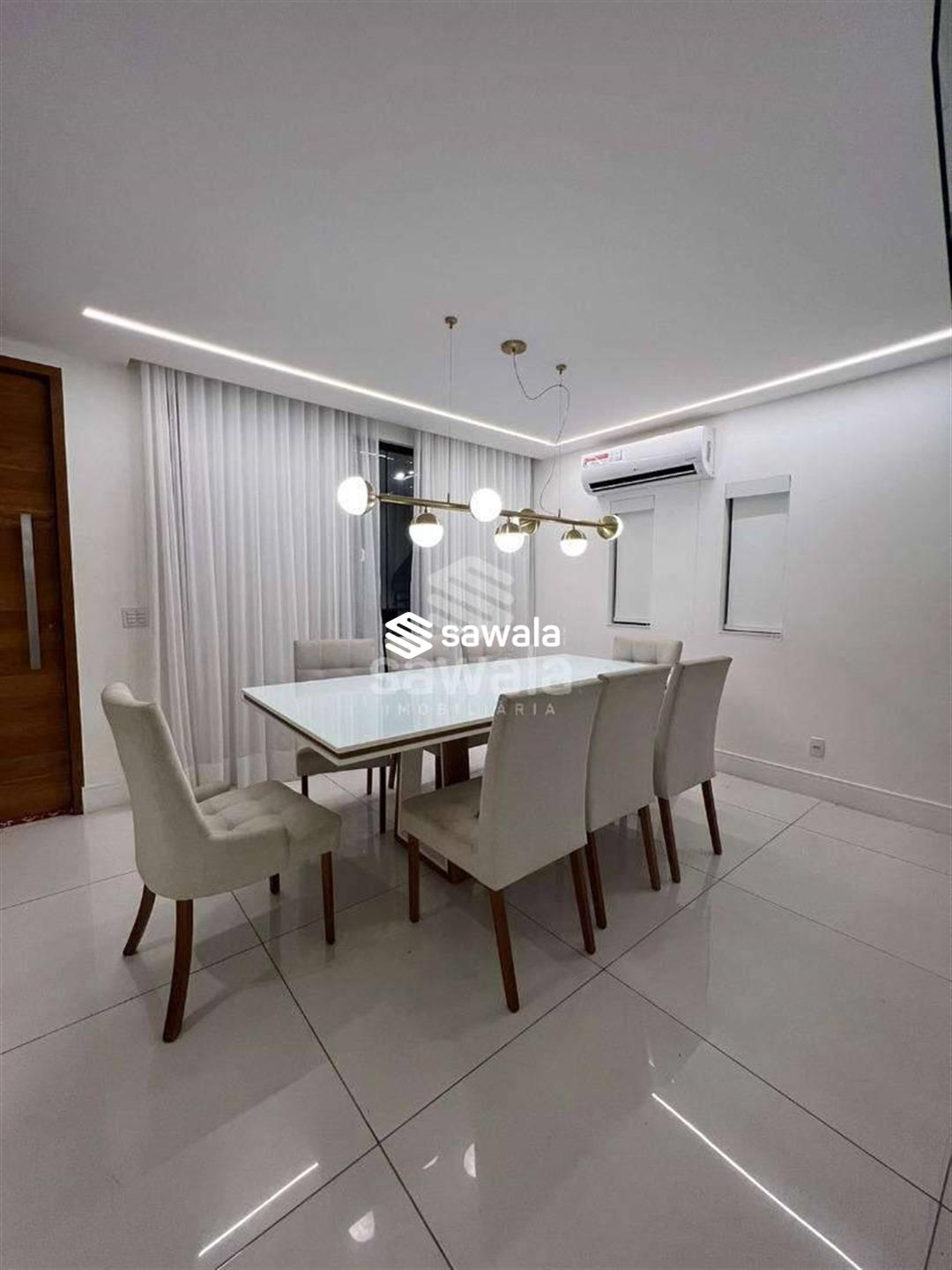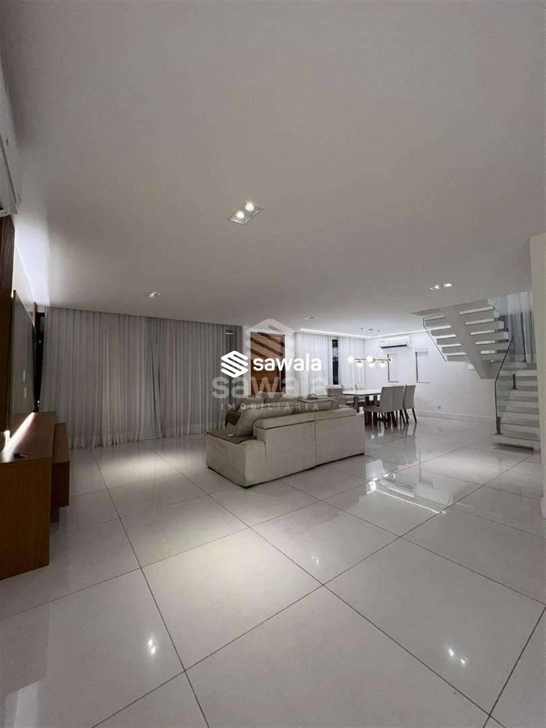 A copa cozinha possui armários planejados, bancadas em granito preto, cooktop por indução, ventilador de teto e forno, integrada à área de lavanderia. O segundo pavimento abriga 4 suítes requintadas, todas com piso em porcelanato, armários planejados, painéis de televisão e mesas de cabeceira, ar condicionado split, camas box e cortinas