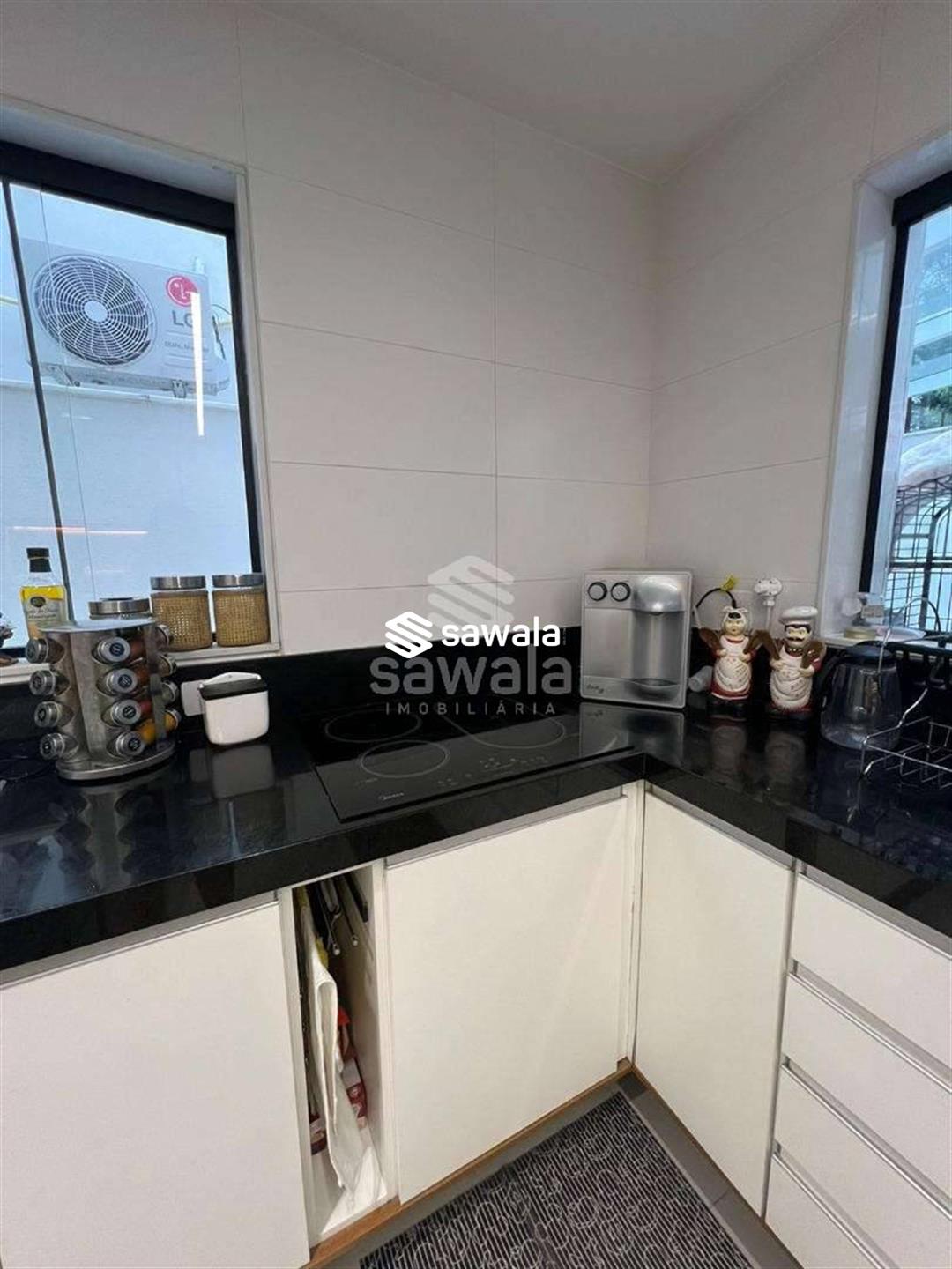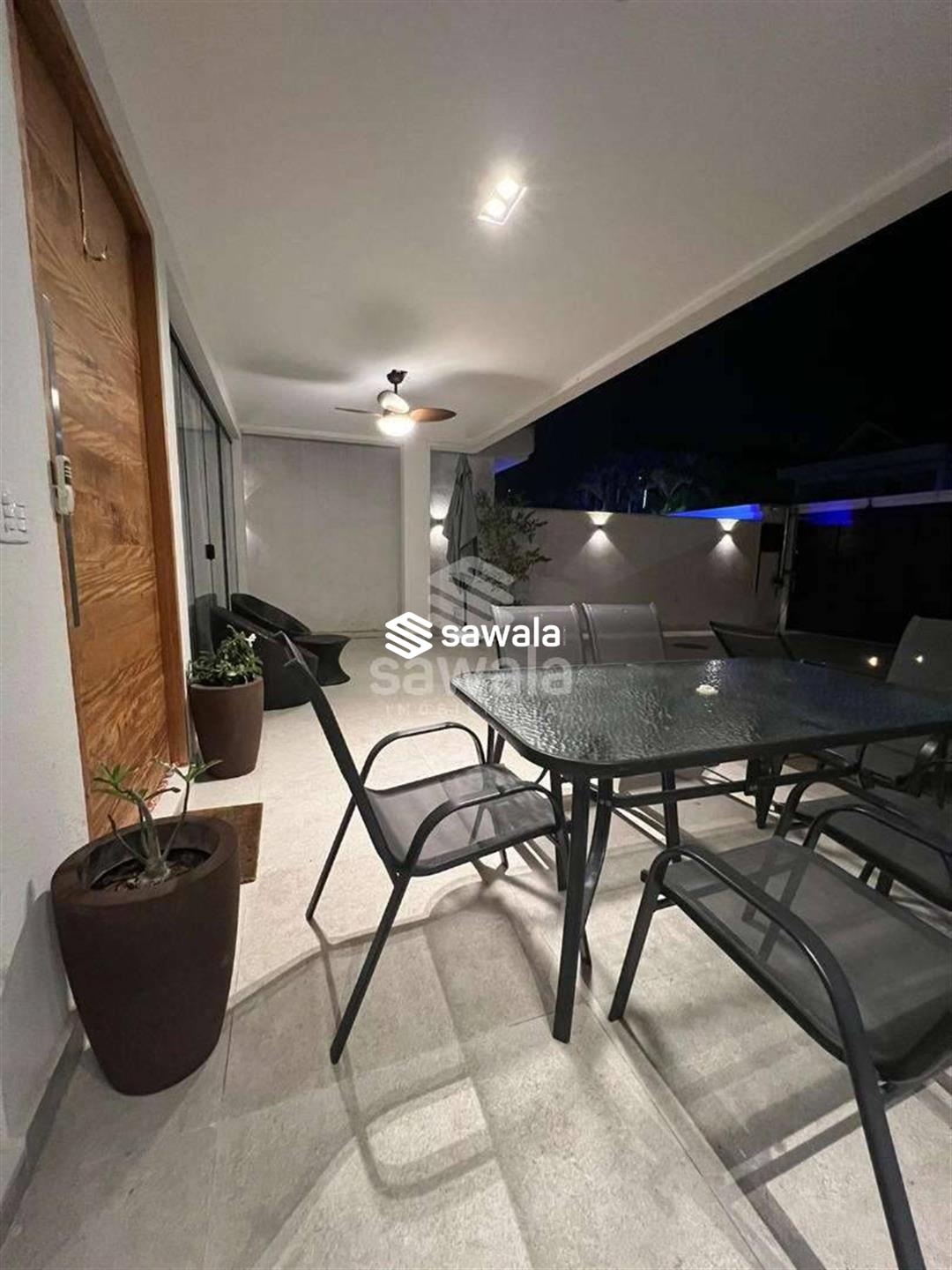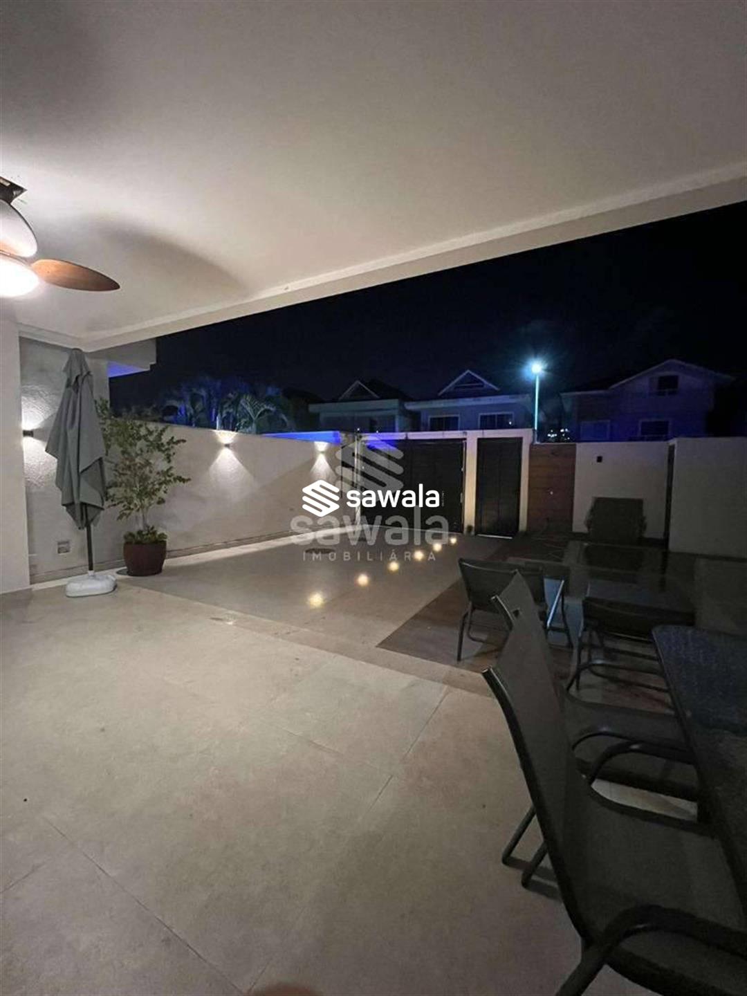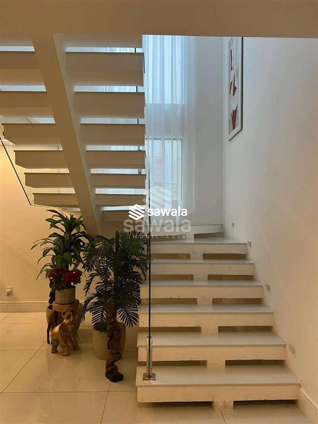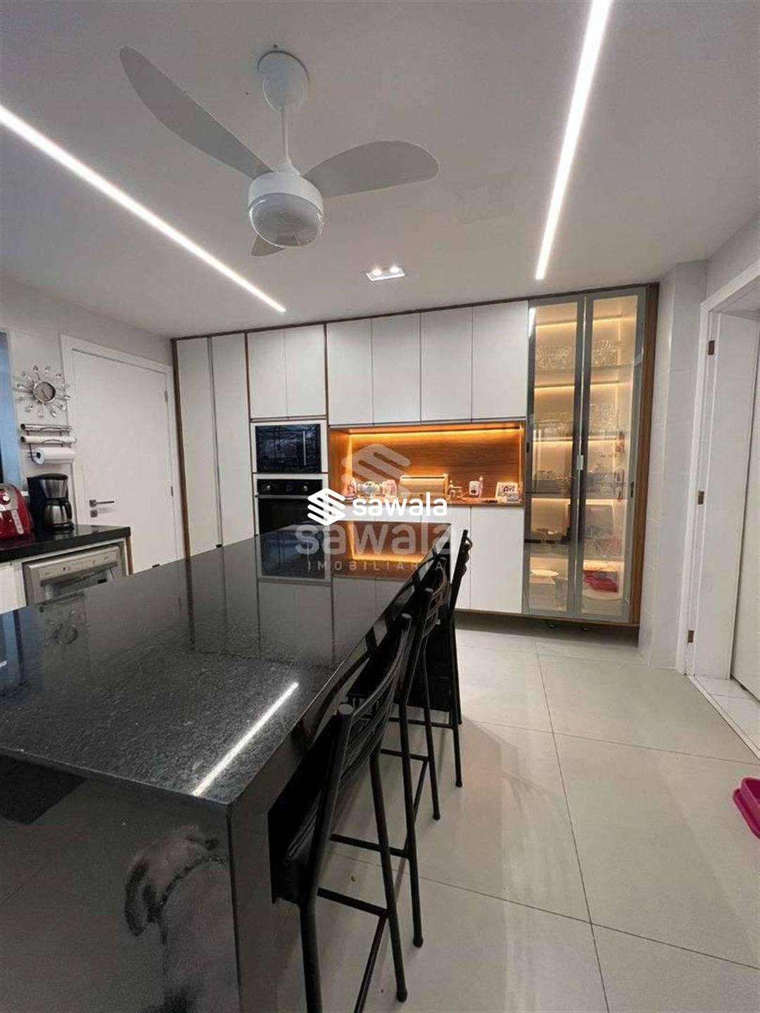 A copa cozinha possui armários planejados, bancadas em granito preto, cooktop por indução, ventilador de teto e forno, integrada à área de lavanderia. O segundo pavimento abriga 4 suítes requintadas, todas com piso em porcelanato, armários planejados, painéis de televisão e mesas de cabeceira, ar condicionado split, camas box e cortinas
