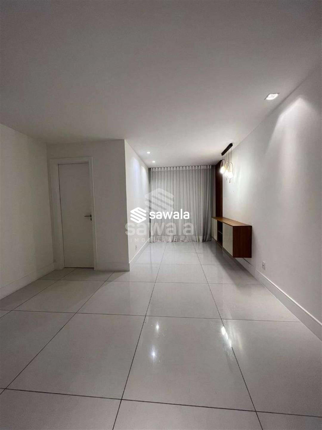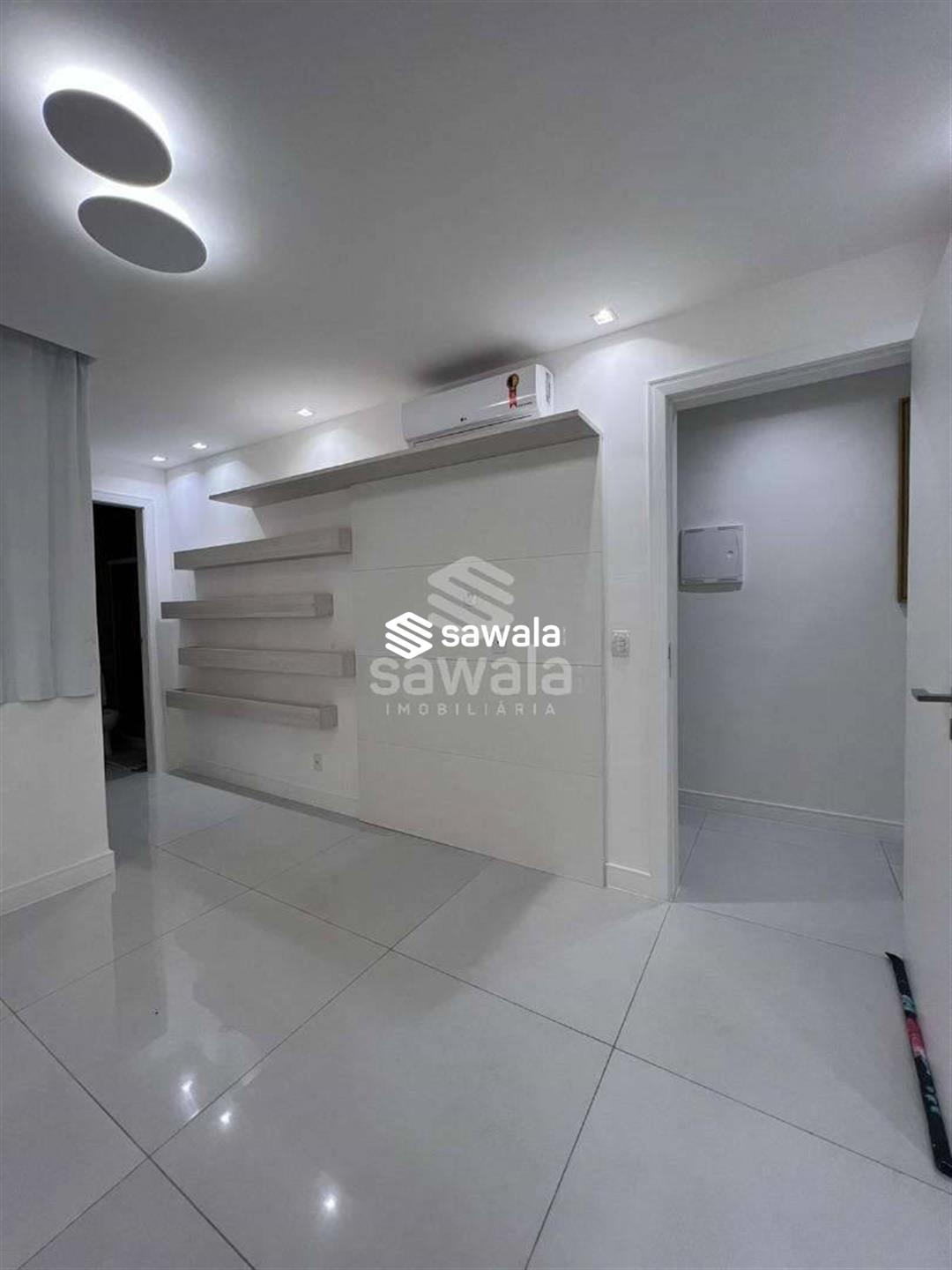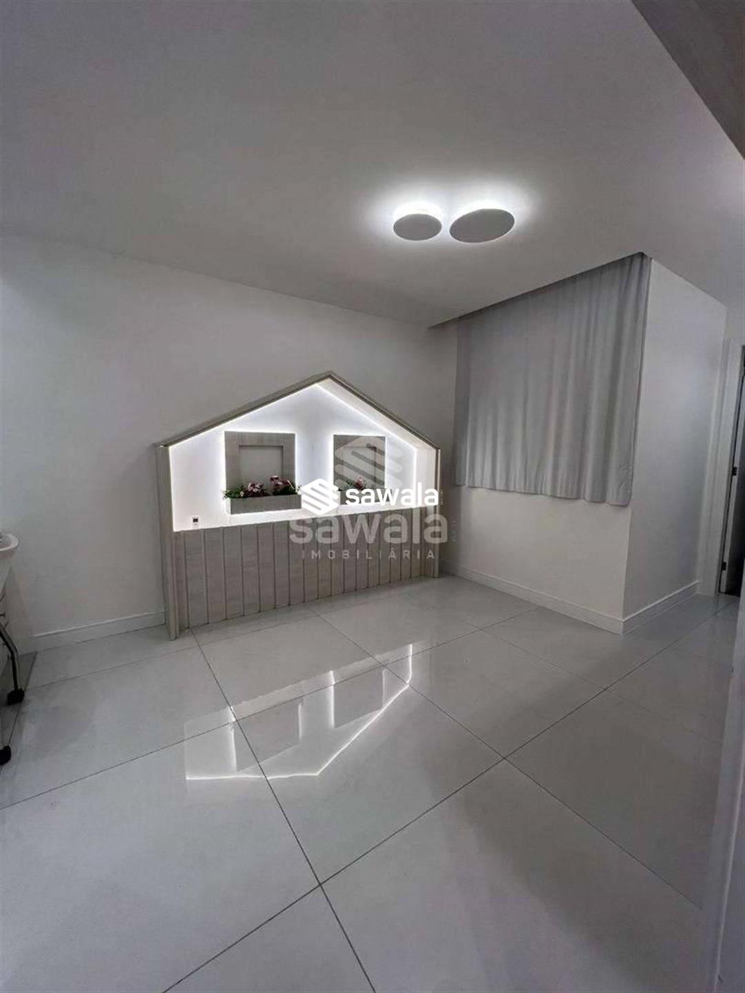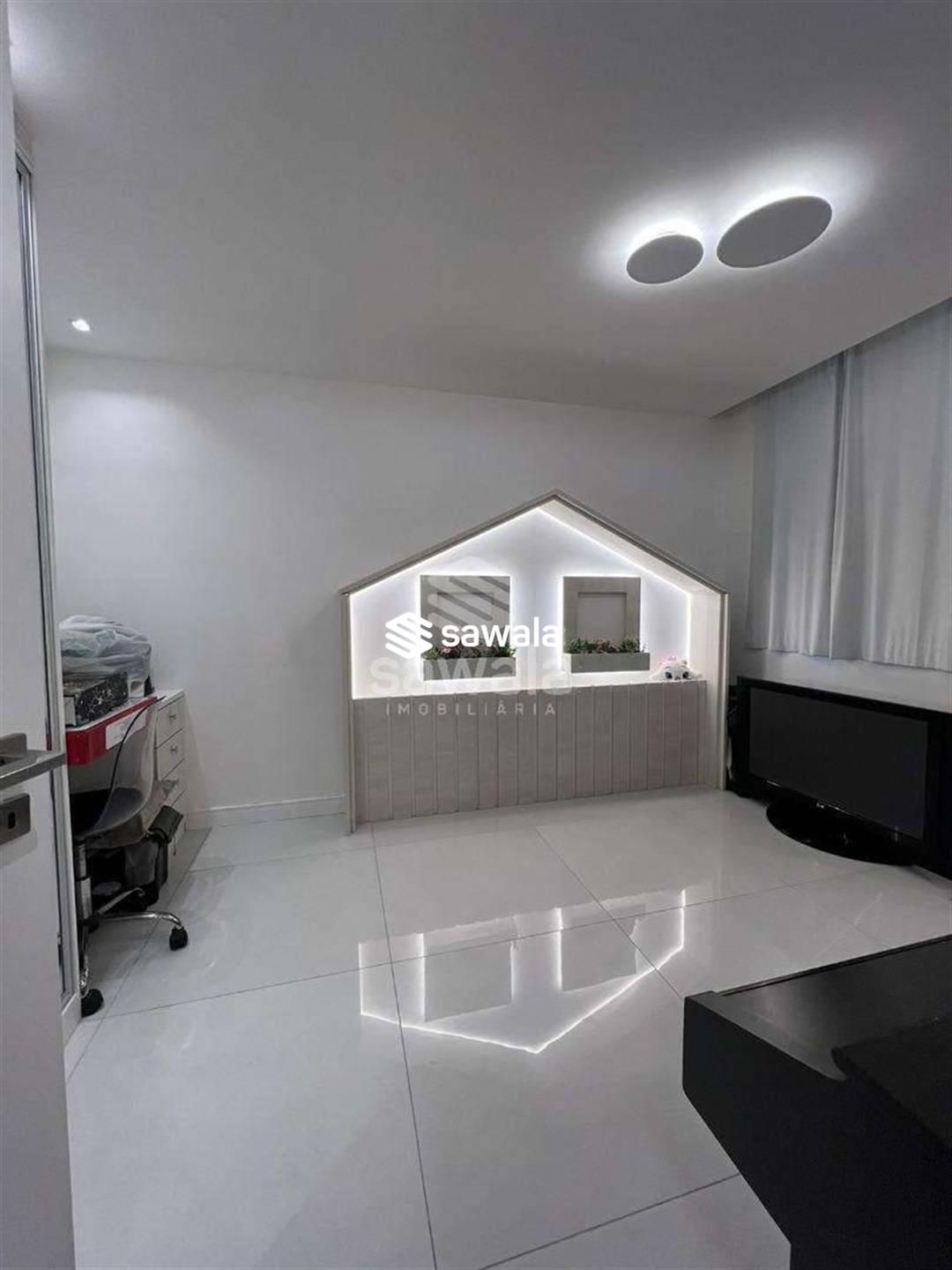 A ampla sala em porcelanato, dividida em 3 ambientes, conta com projeto de iluminação sofisticado, ar condicionado split, cortinas e móveis planejados, complementada por um lavabo