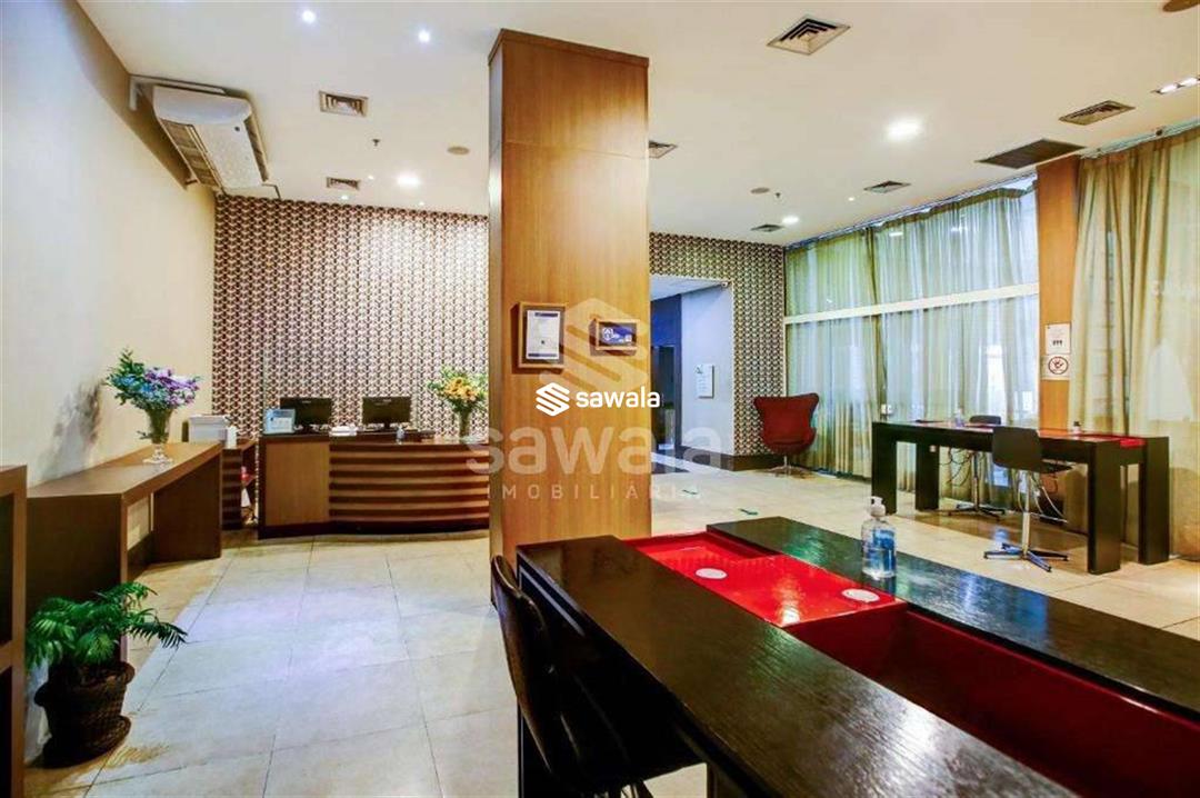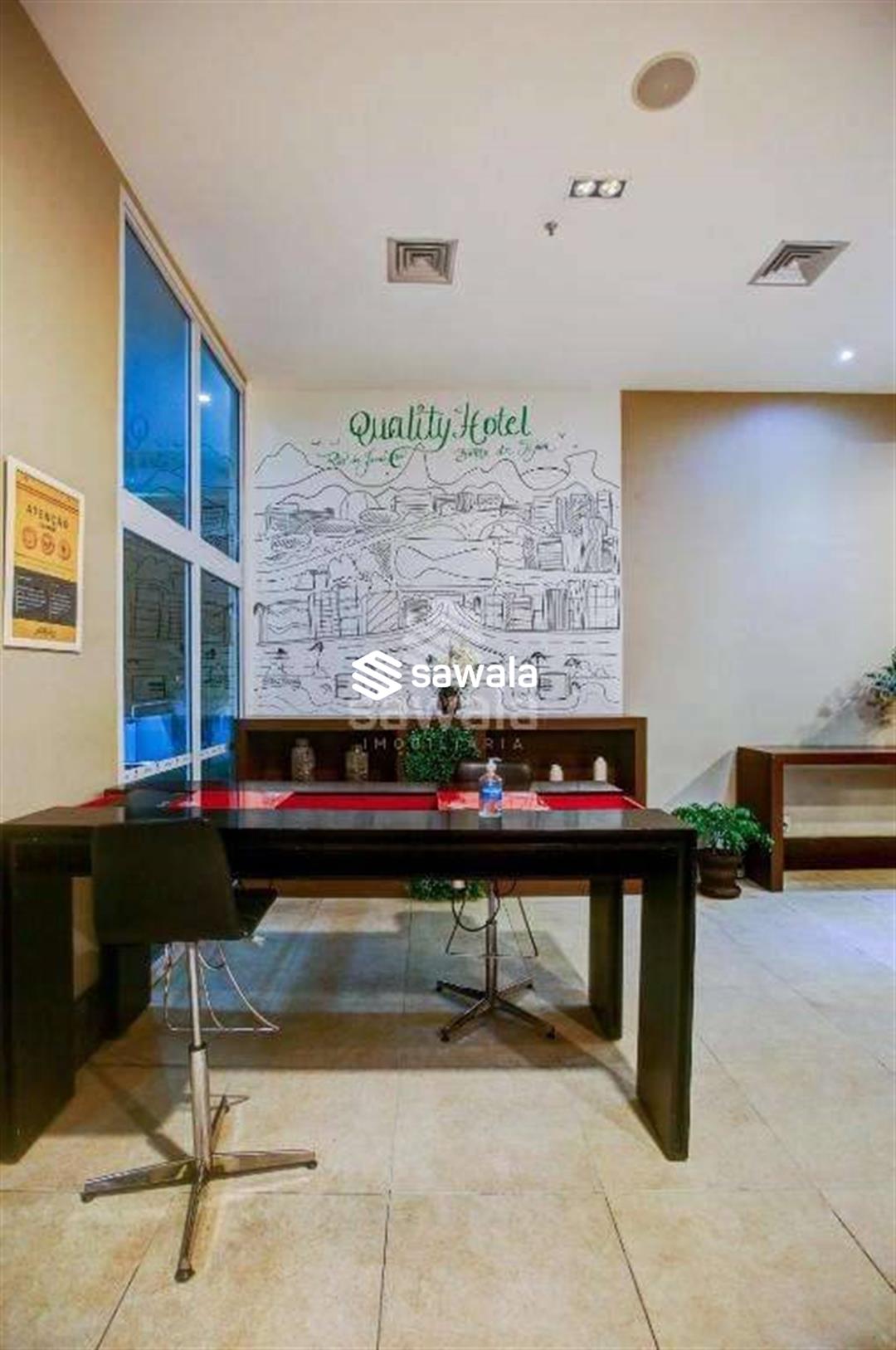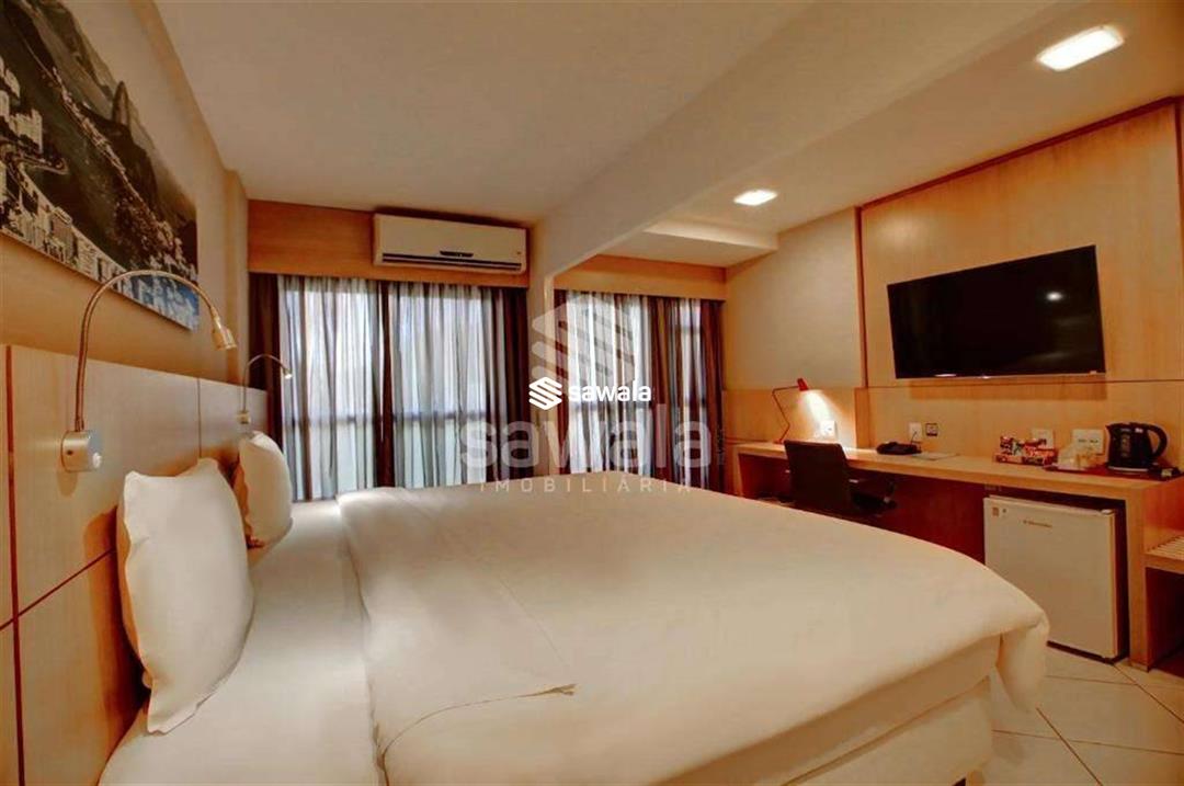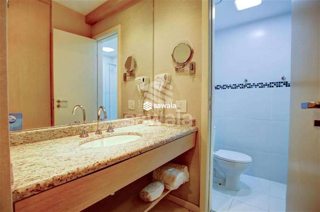 Banheiro da suíte com bancada em granito, secador de cabelo, espelho e blindex. Hotel com serviços pay per use como lavanderia, higienização de apartamento.Condomínio com piscina, restaurante, sala de reuniões, recepção e segurança 24h.Internet e TV a cabo inclusos no valor de condomínio.1 vaga de garagem.