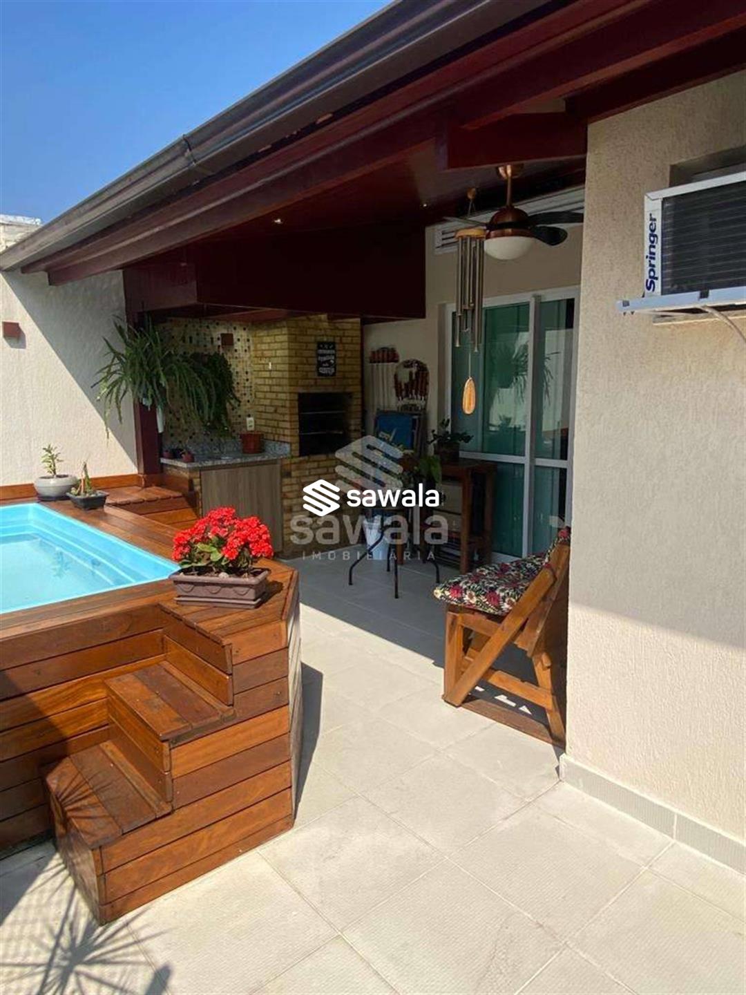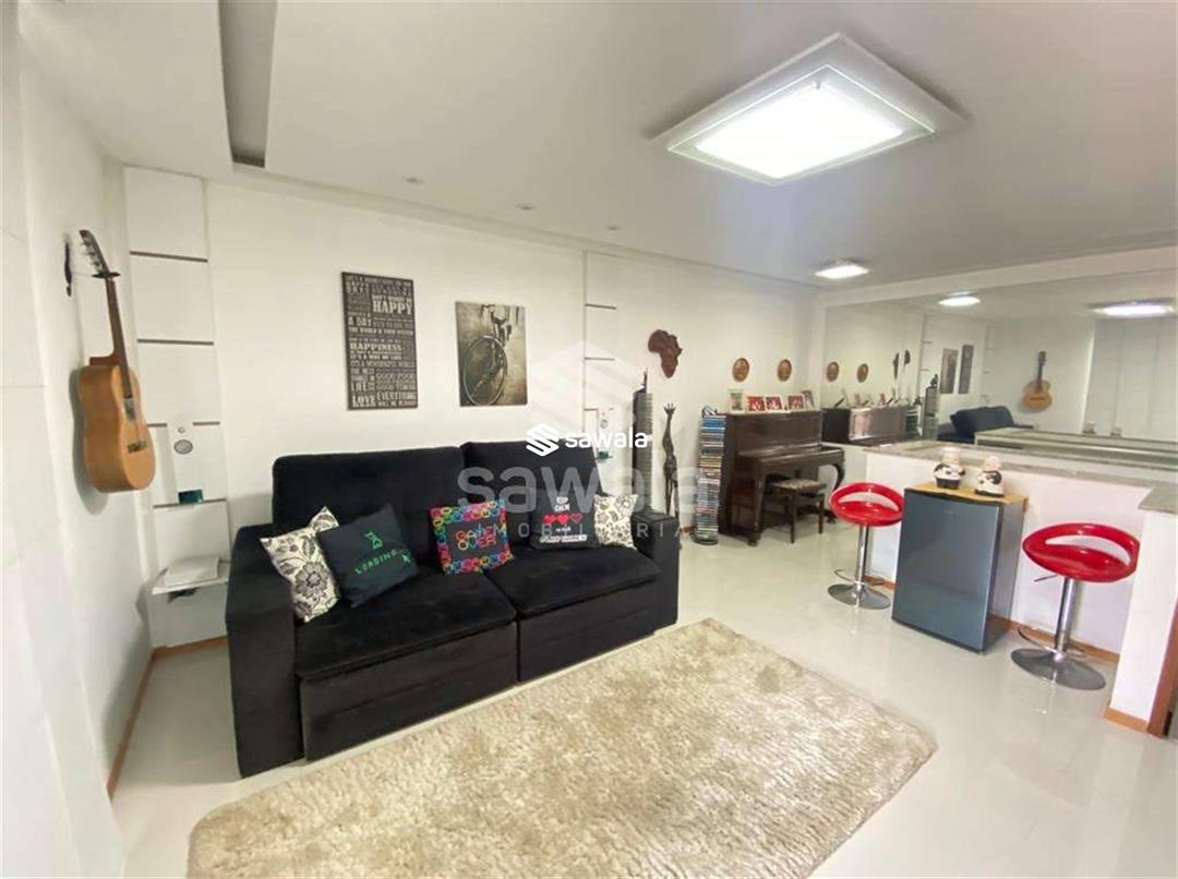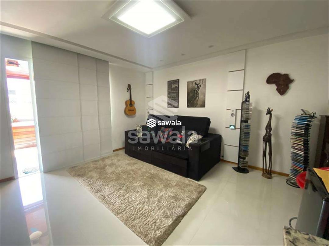 Pavimento superior com ampla sala com painel e home theater, suíte e terraço com piscina, deck, churrasqueira e sistema de som, sound bar.Imóvel repleto de armários, papel de parede, spots, iluminação embutida, rebaixo de teto em gesso, tela na varanda.