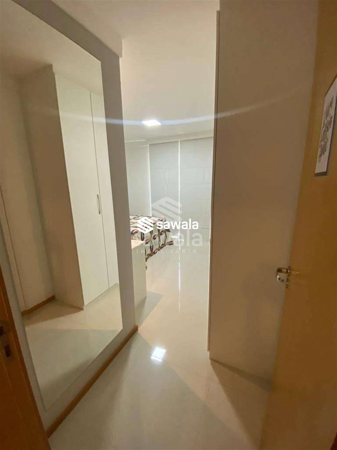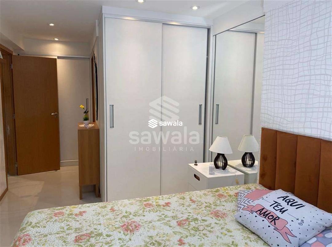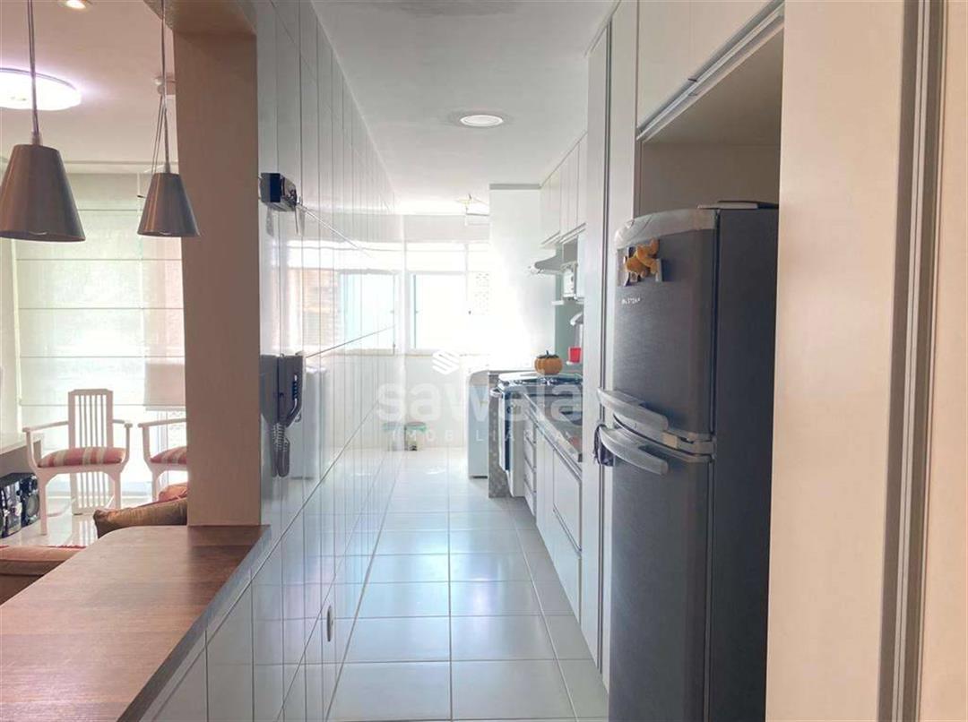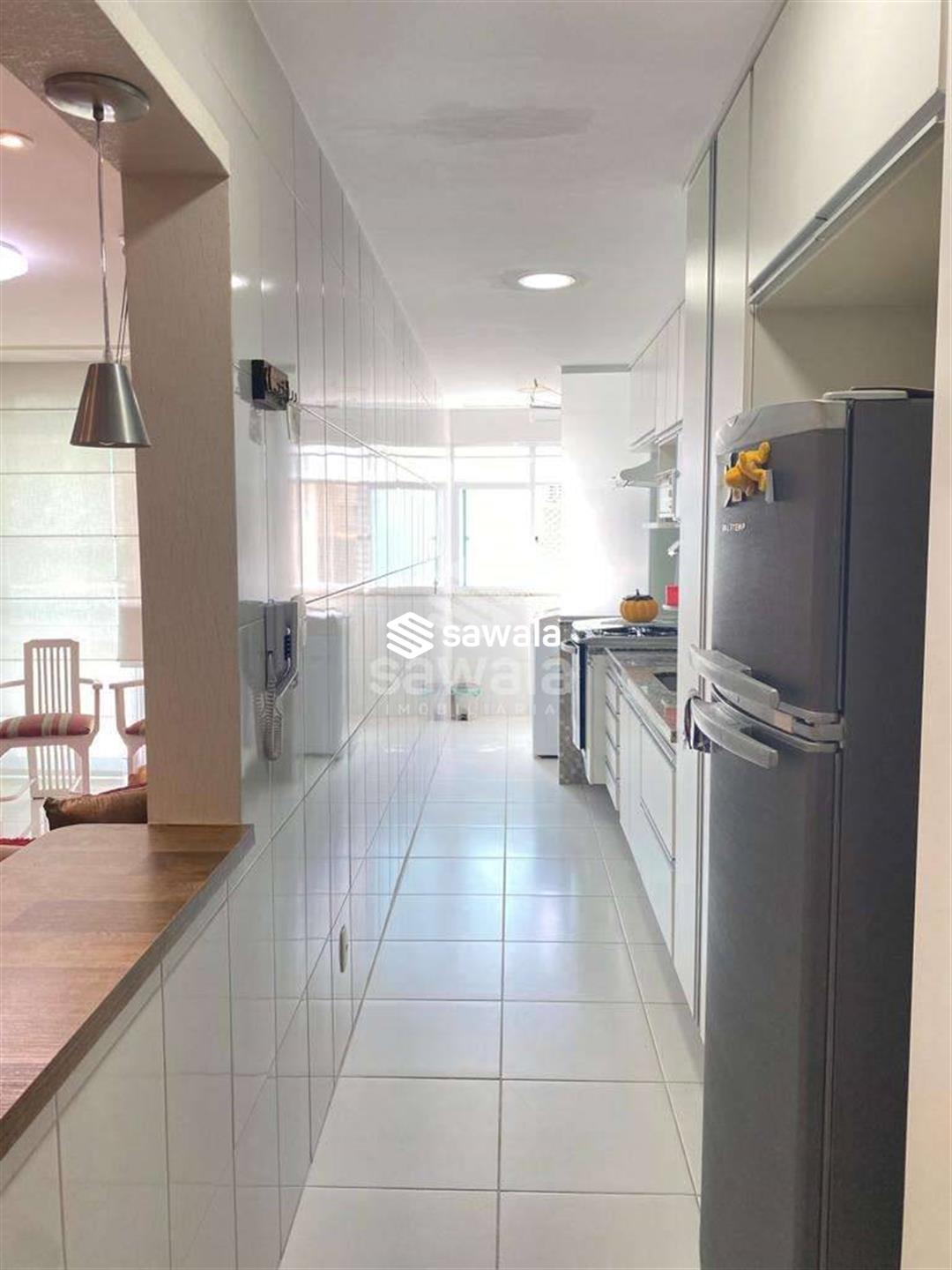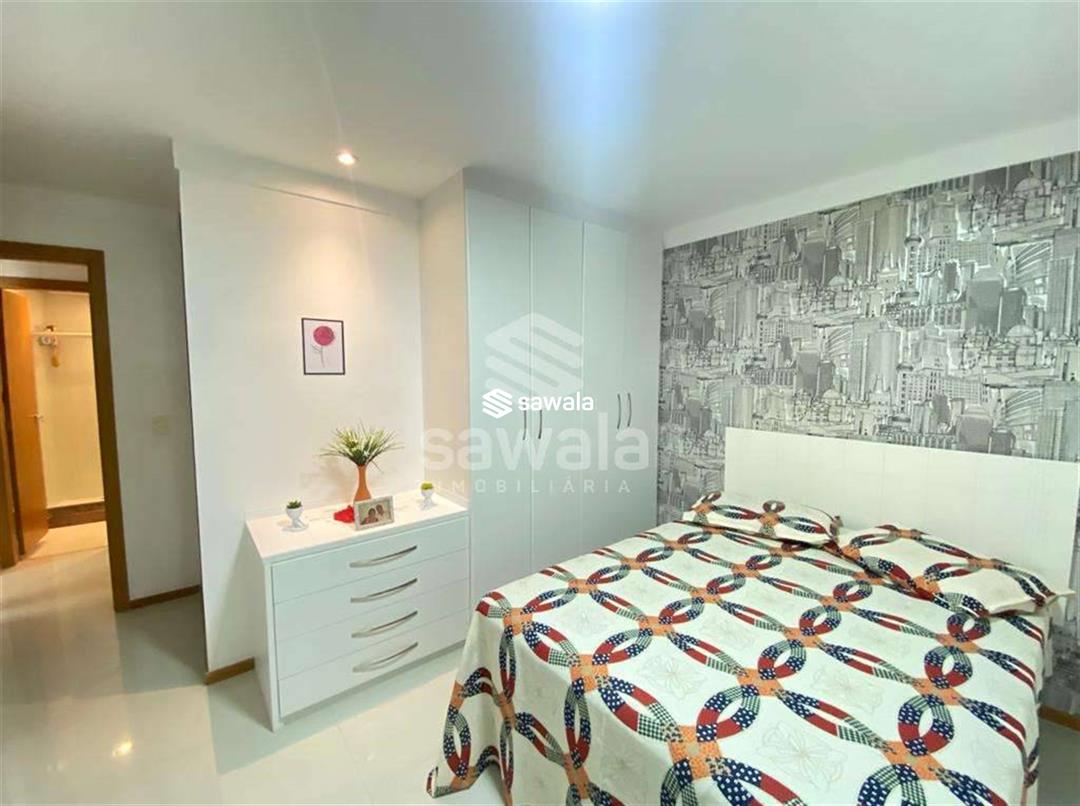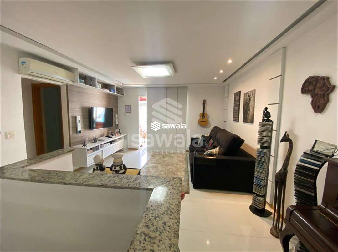 Sala com 2 ambientes jantar e estar, cozinha americana, com bancada de madeira em harmonia com o painel de tv, área de serviço, lavabo, banheiro social, suíte e quarto repleto de armários, iluminação embutida e papel de parede
