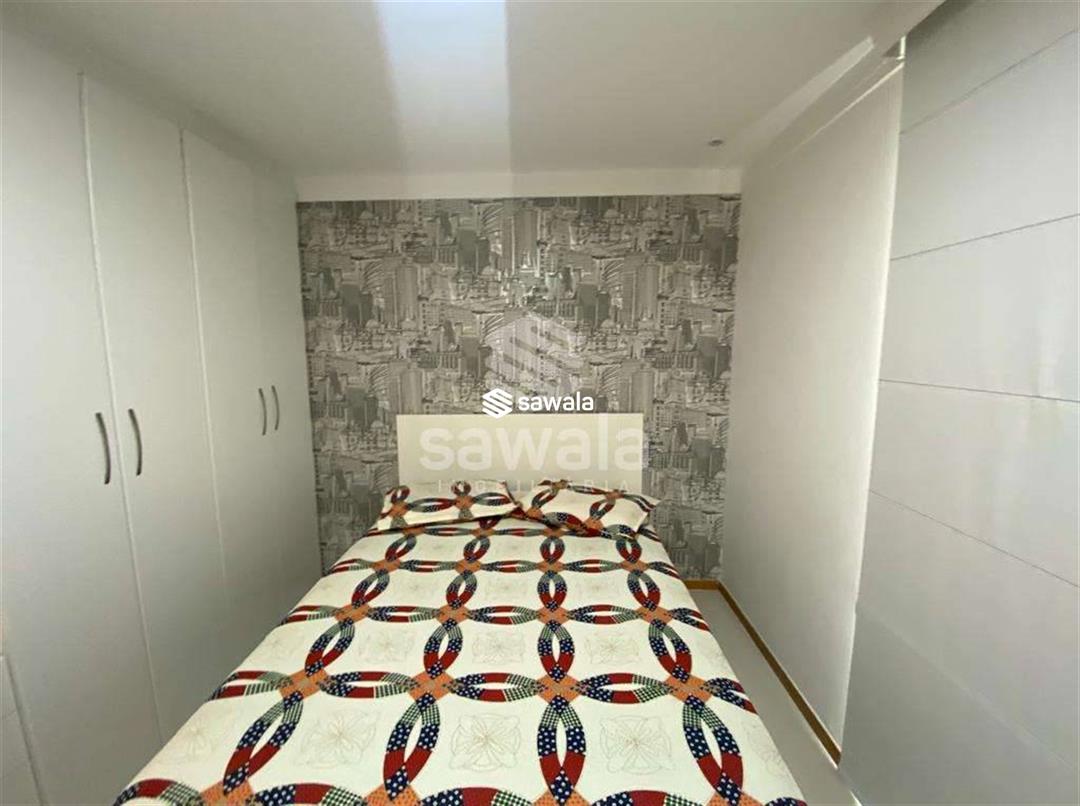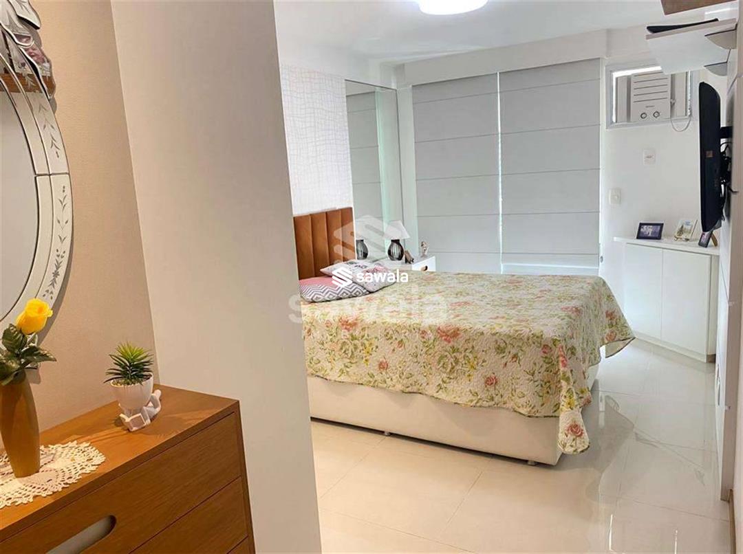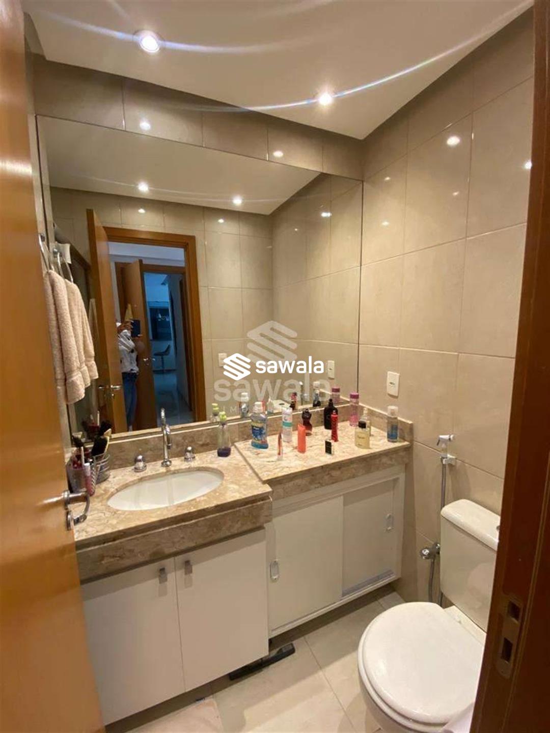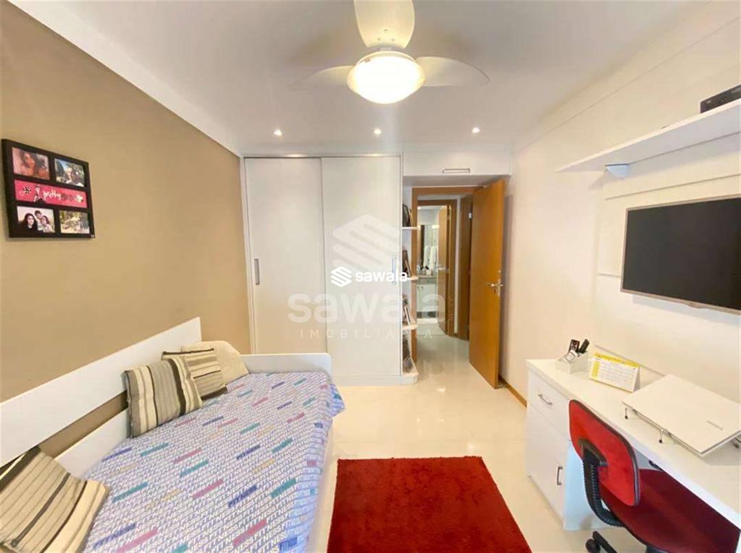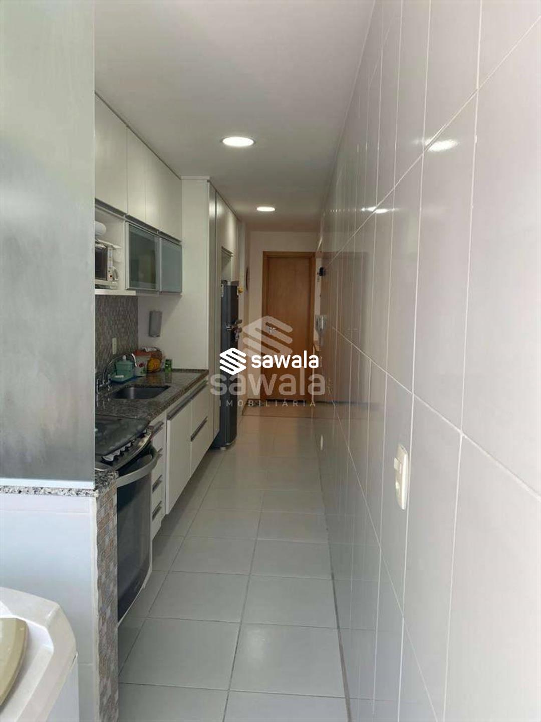 Sala com 2 ambientes jantar e estar, cozinha americana, com bancada de madeira em harmonia com o painel de tv, área de serviço, lavabo, banheiro social, suíte e quarto repleto de armários, iluminação embutida e papel de parede