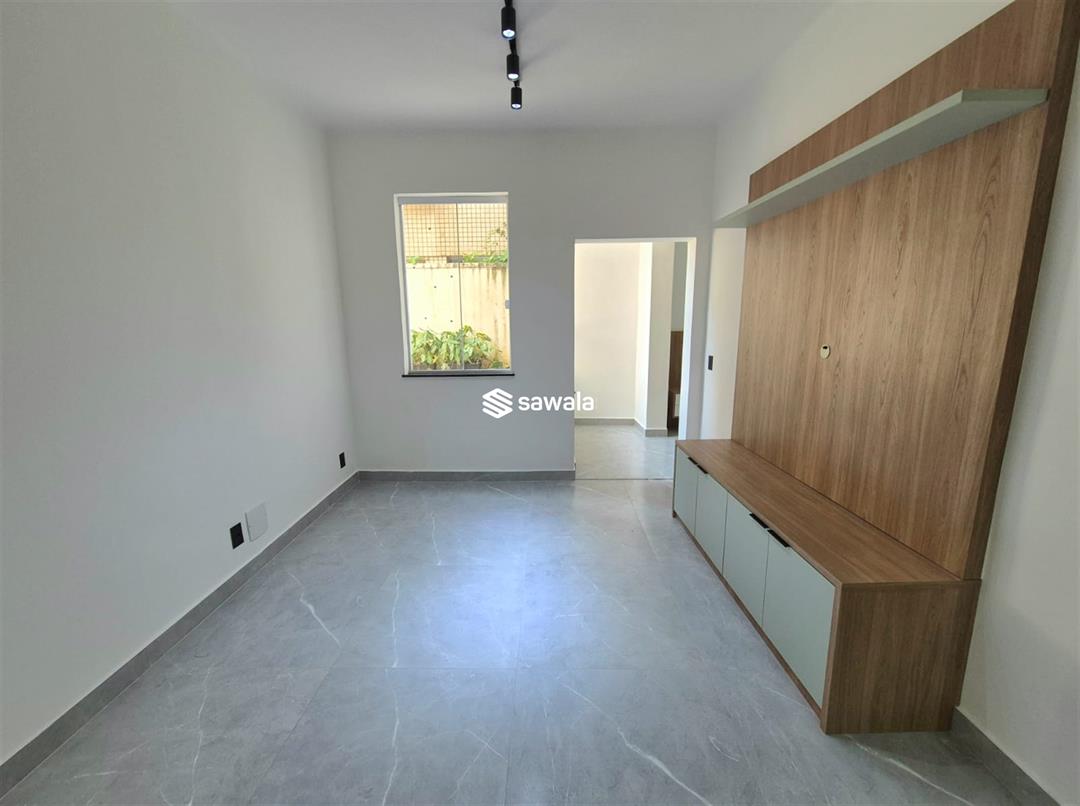 Sala em 2 ambientes com copa, cozinha com passador aberto moderno, cooktop e bancada em mármore, banheiro social amplo com blindex, quarto sendo suíte com blindex