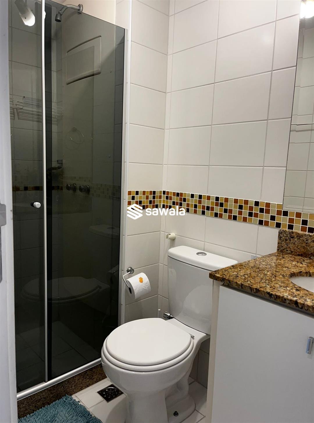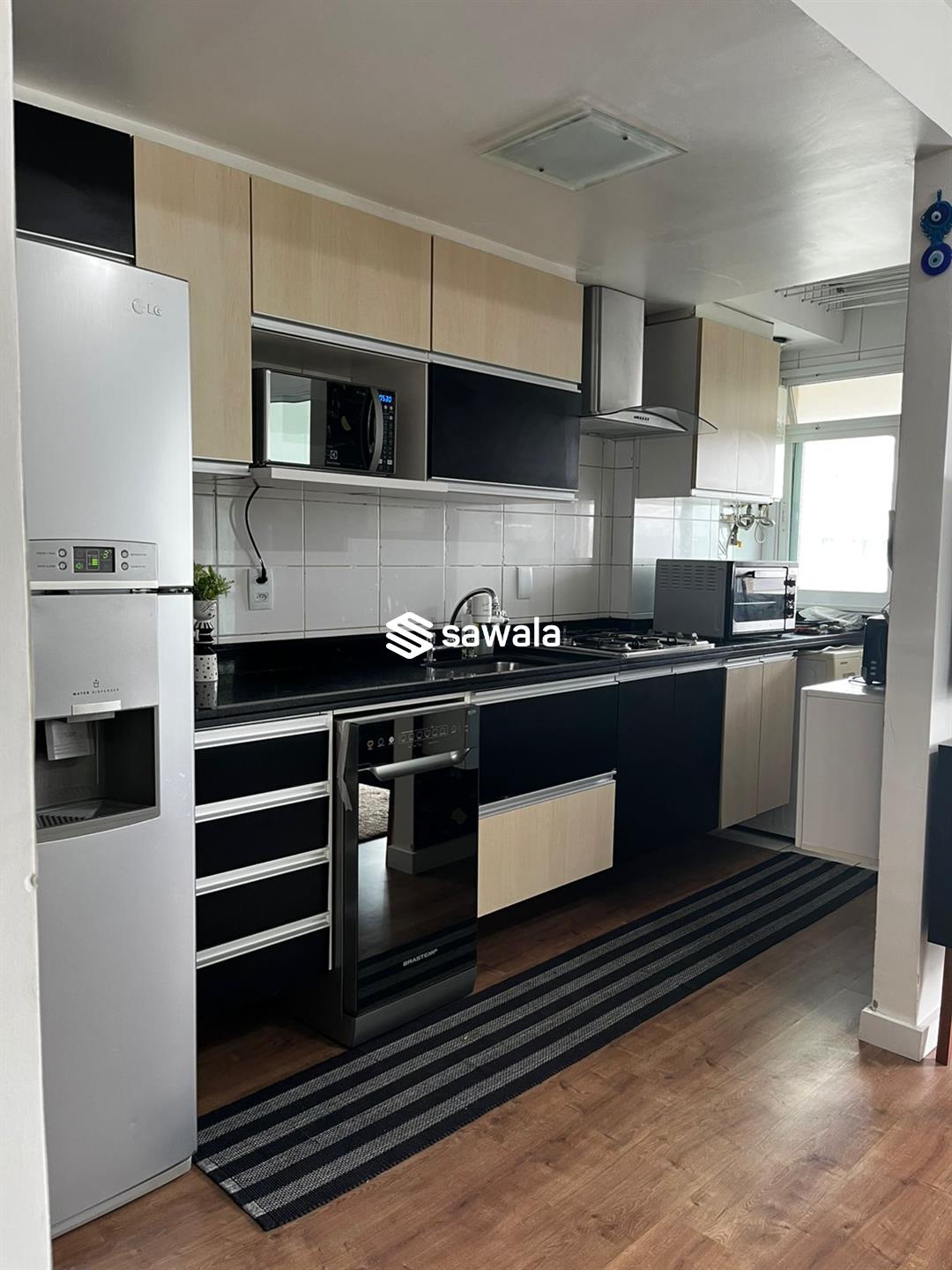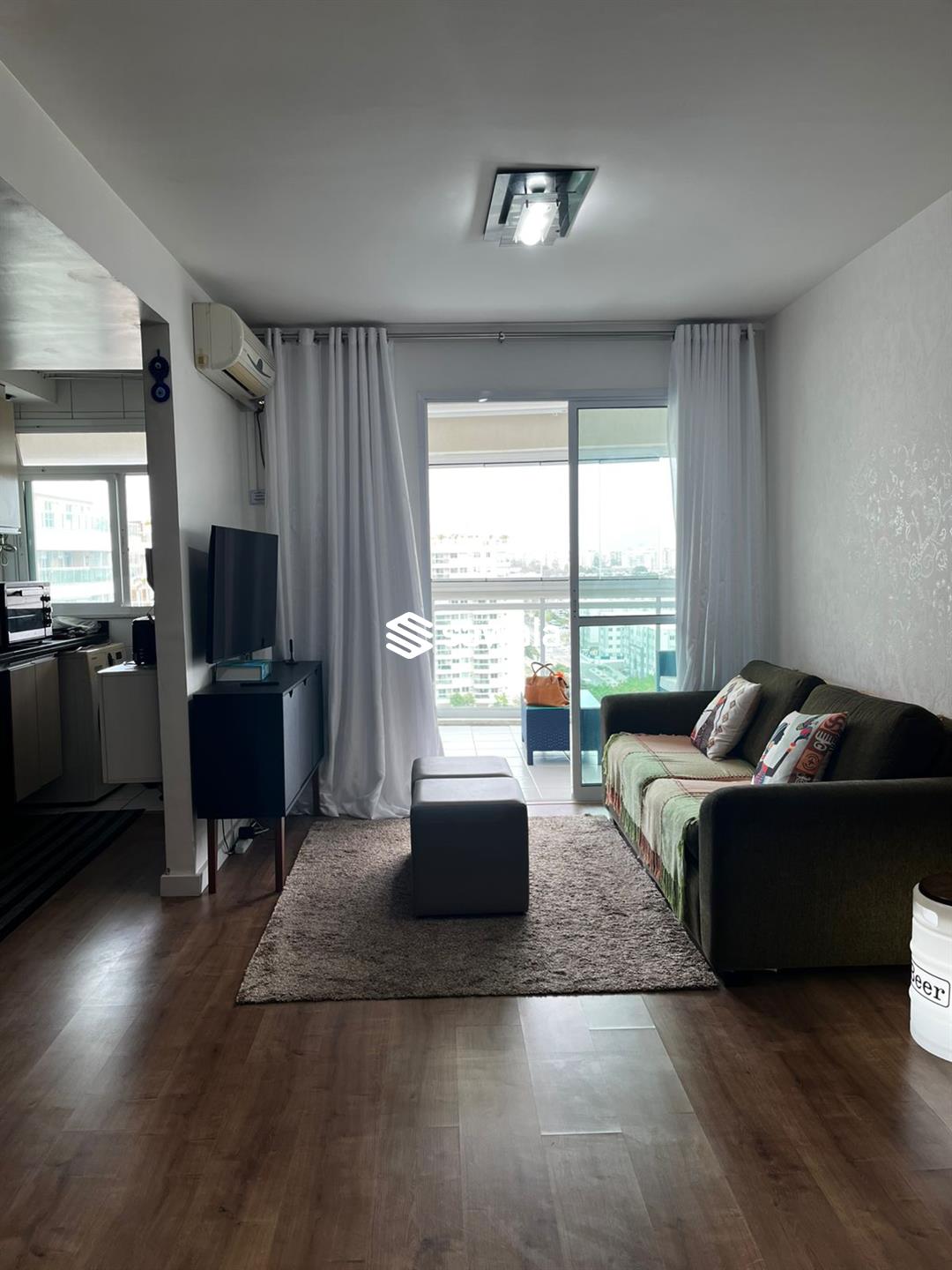 Apartamento mobiliado.Sala ampla c/ ar tipo split com TV, sofá, mesa com 4 cadeiras, varanda com cortina de vidro, cortina interna automática e conjunto de estofado, cozinha integrada a sala , com geladeira, lava -louça, lavadora lava e seca, fogão, armários em cima e embaixo da pia, aquecedor digital