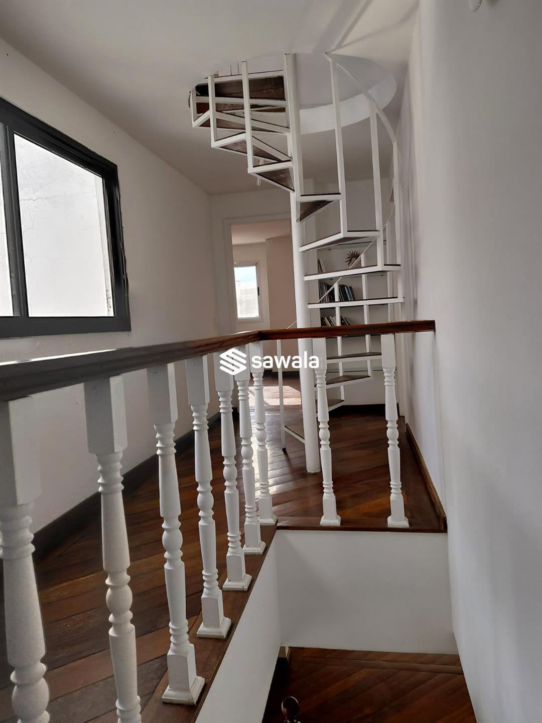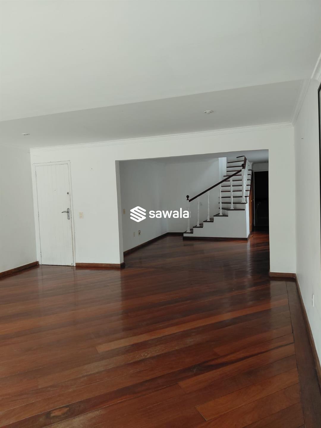 Cobertura com ampla sala de estar e imponente escadaria em madeira, na sala de jantar