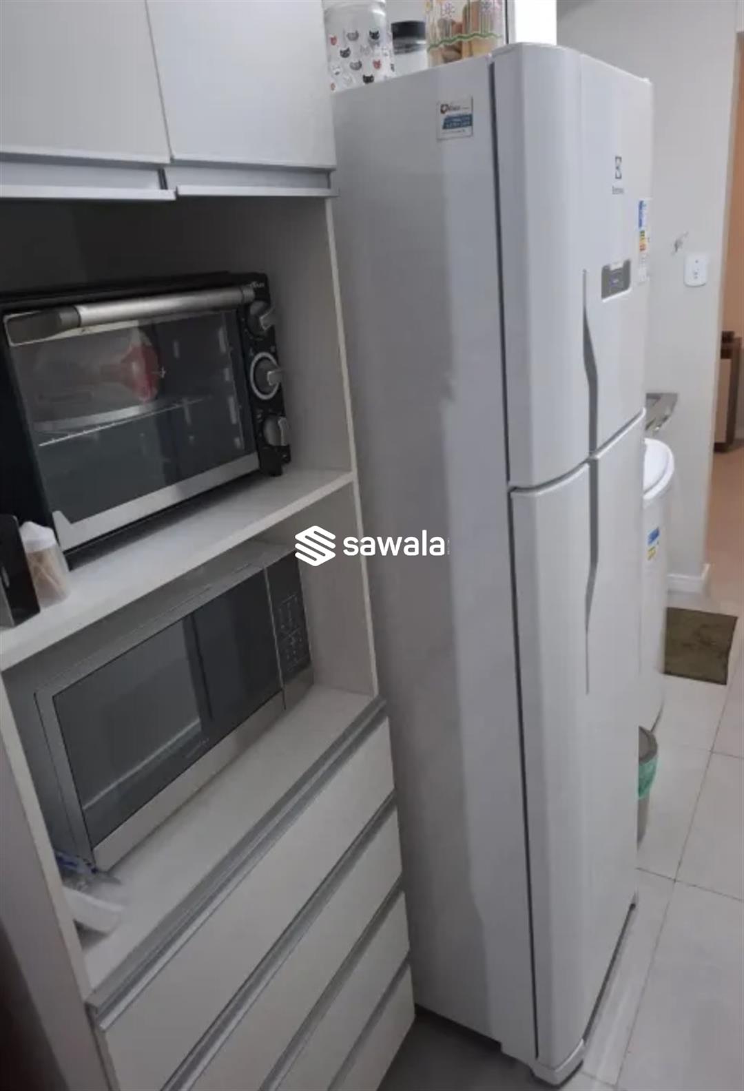 A cozinha integrada, com armários novos, otimiza o espaço e facilita o dia a dia