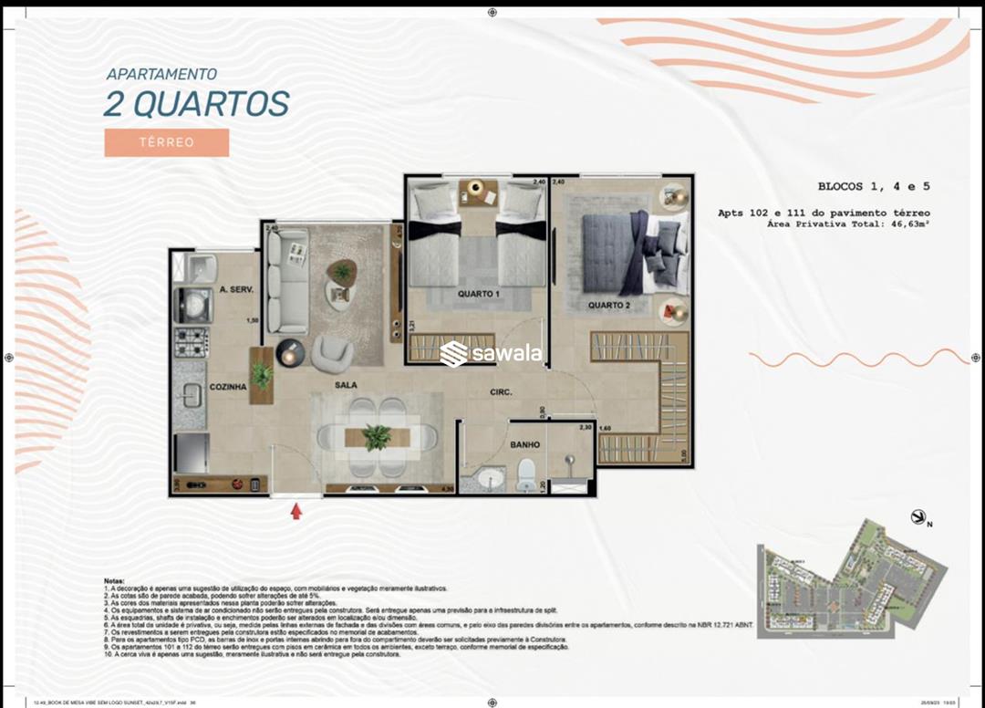 O condomínio fica em excelente localização e oferece área de lazer completa, segurança e estacionamento com uma vaga para cada imóvel.Área privativa 46,63 m2, 2 quartos.R