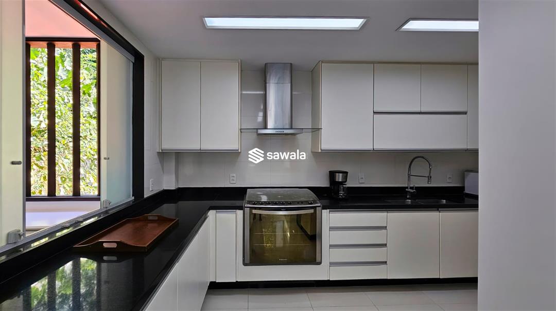 No nível de acesso, salão conectado à espaçosa varanda voltada para o jardim, sala de jantar, lavabo, copa-cozinha com despensa e área de serviço, dependências completas com 2 suítes